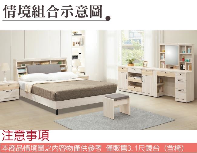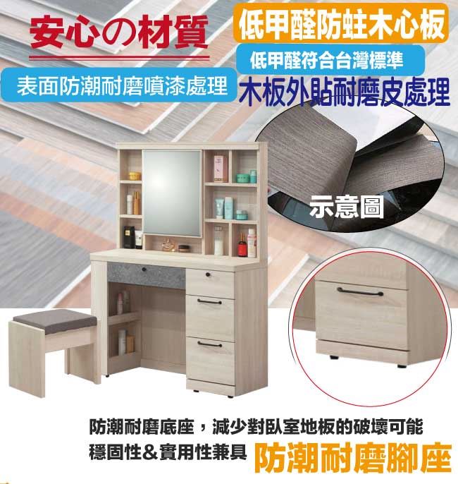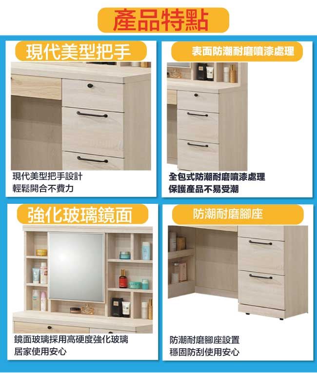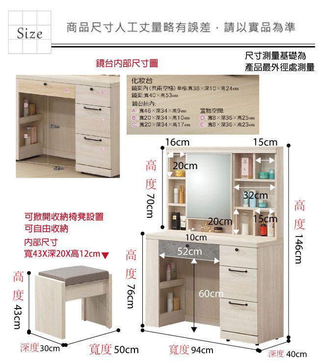材質 | ◆產品名稱:【綠家居】夏亞3.1尺開合式鏡面鏡台組合(二色可選+含化妝椅) 尺寸:(寬)94x(深)40(高)146公分 ◆材質: 材質:防蛀木心板+防潮耐磨腳座+五金滑軌結構+強化玻璃鏡面 噴漆:防潮耐磨噴漆處理 |