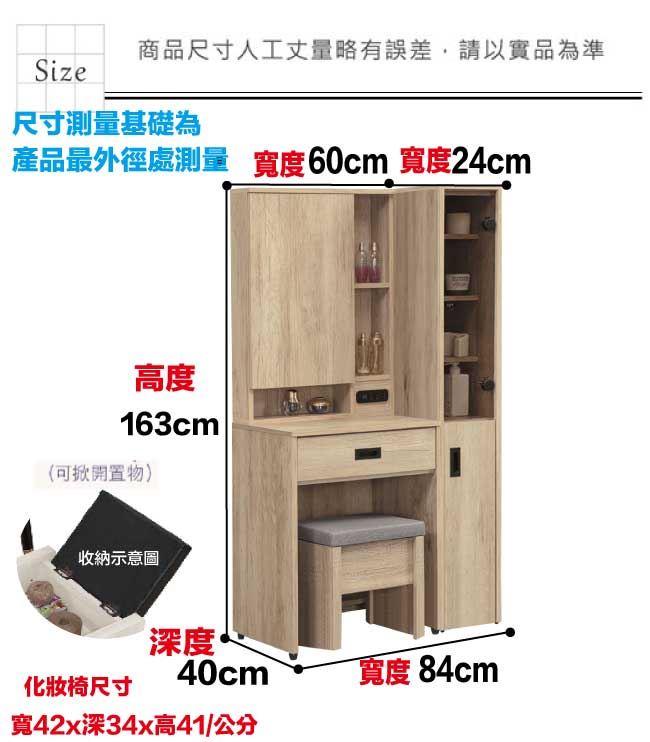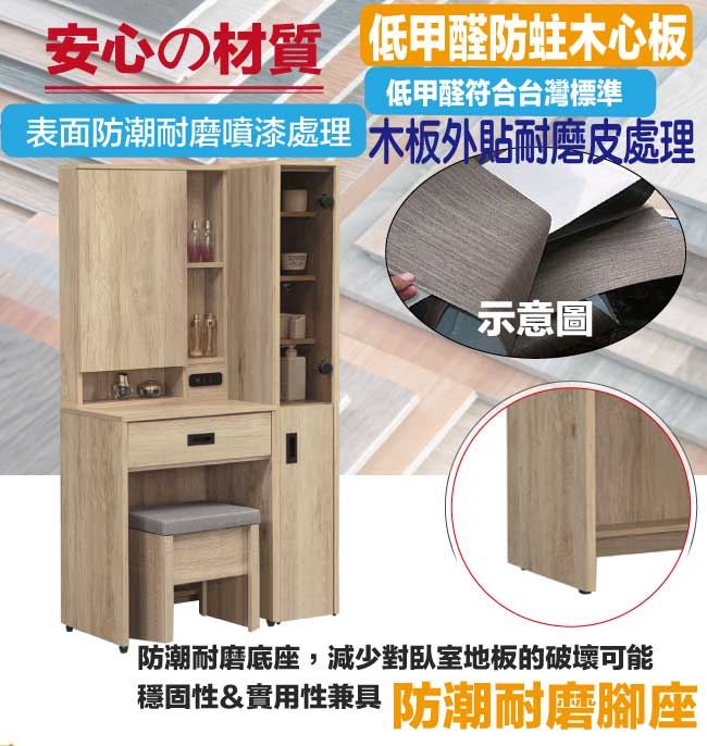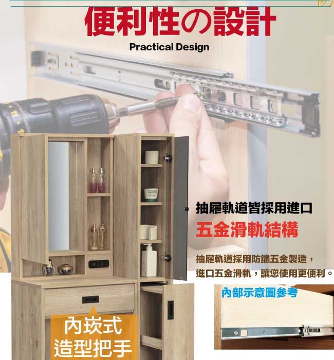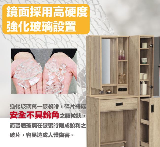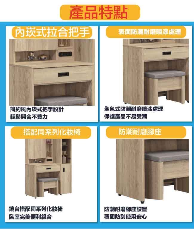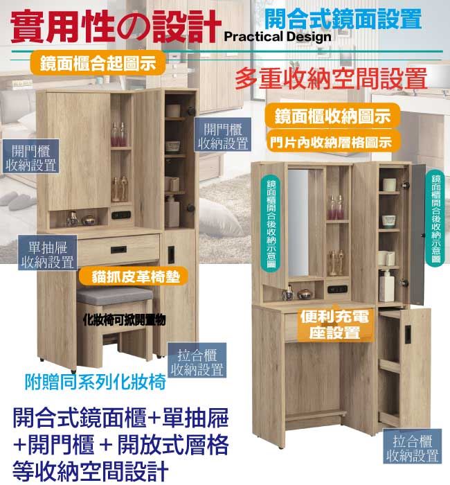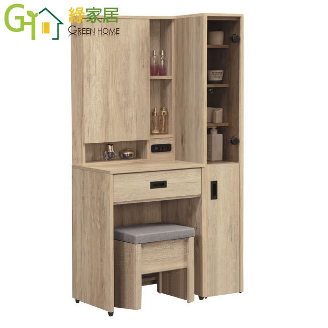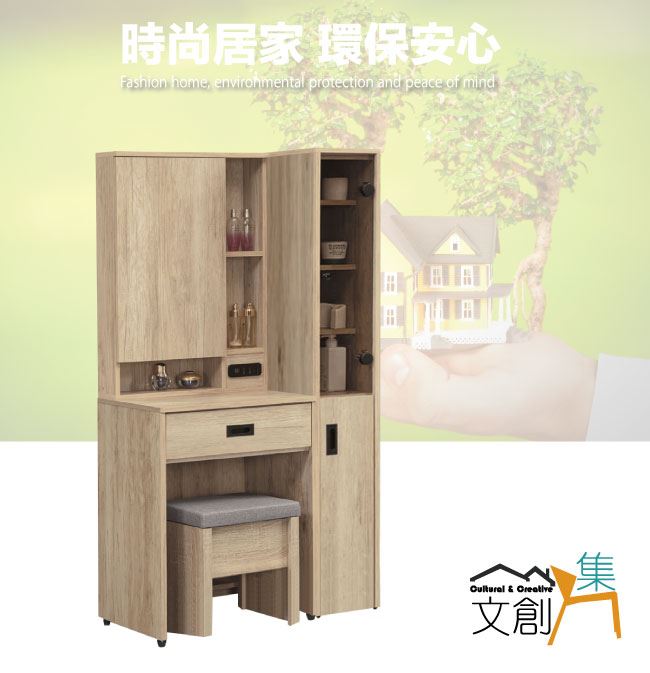 商 品 介 紹 | 【綠家居】爾晴3尺開合式鏡面鏡台組合(含化妝椅) 原橡木紋色系+現代簡約風格+安心材質製造,使用放心+搭配居家更便利,整體採用防蛀木心板+防潮耐磨腳座+五金滑軌結構+強化玻璃鏡面等材質搭配外層採用優莉坦耐磨全包式噴漆處理 ,採用開合式鏡面櫃+單抽屜+開門櫃+拉合櫃+開放層格等收納空間設計,全由專人配送到家,專業安心服務,替你省下更多時間! 【商品特色】 原橡木紋色系+現代簡約風格+安心材質製造,使用放心+搭配居家更便利 此組鏡台組合含可收納化妝椅搭配,化妝椅座墊可掀起內含收納層格可用來置放私人物品,增加實用機能性 防蛀木心板+防潮耐磨腳座+五金滑軌結構+強化玻璃鏡面等材質 採用開合式鏡面櫃+單抽屜+開門櫃+拉合櫃+開放層格等收納空間設計 此商品不需要DIY組立,此商品為組立後之成品 品質保證、專業設計、貼心服務 全由專人配送到家,專業安心服務,替您省下更多時間