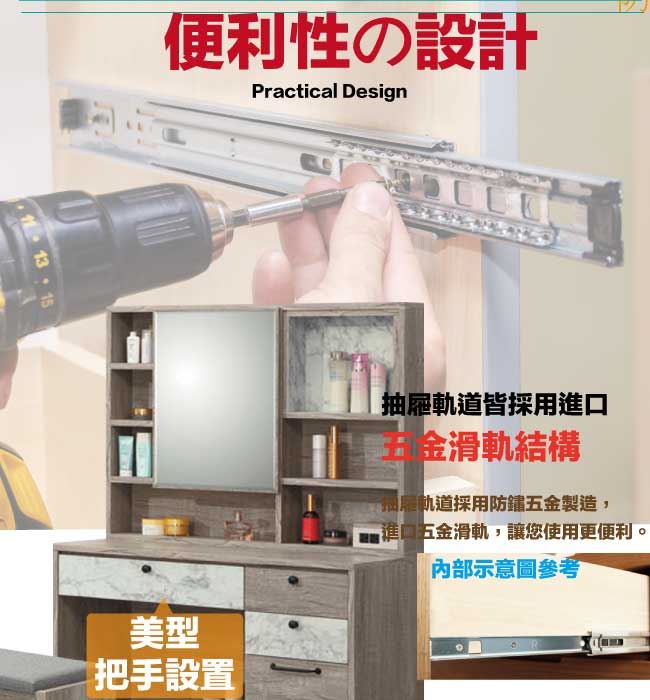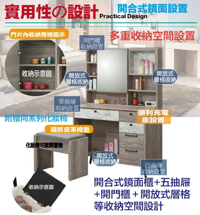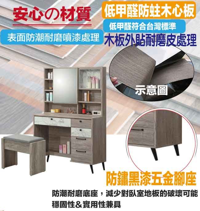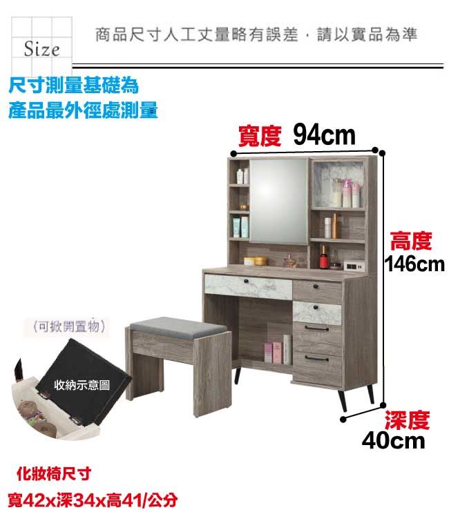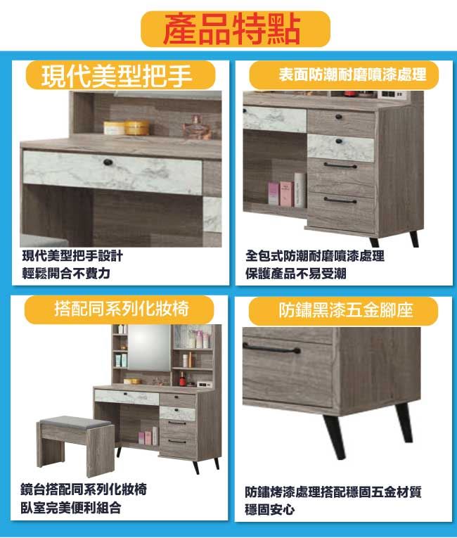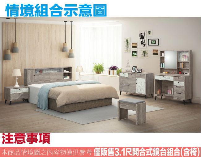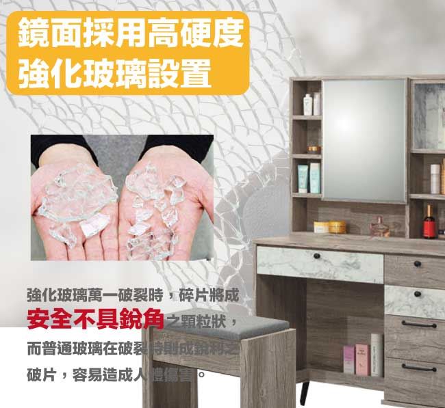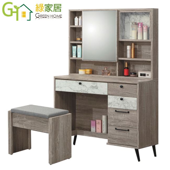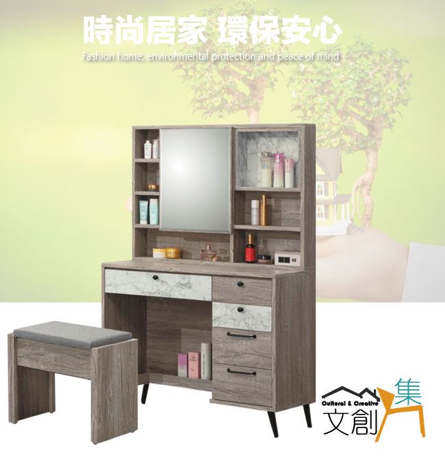 商 品 介 紹 | 【綠家居】希亞卡3.1尺開合式鏡面鏡台組合(含化妝椅) 灰橡木紋雙色系+現代簡約風格+安心材質製造,使用放心+搭配居家更便利,整體採用防蛀木心板+防鏽黑漆五金腳座+五金滑軌結構+強化玻璃鏡面等材質搭配外層採用優莉坦耐磨全包式噴漆處理 ,採用開合式鏡面櫃+五抽屜+開門櫃+開放層格等收納空間設計,全由專人配送到家,專業安心服務,替你省下更多時間! 【商品特色】 灰橡木紋雙色系+現代簡約風格+安心材質製造,使用放心+搭配居家更便利 此組鏡台組合含可收納化妝椅搭配,化妝椅座墊可掀起內含收納層格可用來置放私人物品,增加實用機能性 防蛀木心板+防鏽黑漆五金腳座+五金滑軌結構+強化玻璃鏡面等材質 採用開合式鏡面櫃+五抽屜+開門櫃+開放層格等收納空間設計 此商品不需要DIY組立,此商品為組立後之成品 品質保證、專業設計、貼心服務 全由專人配送到家,專業安心服務,替您省下更多時間