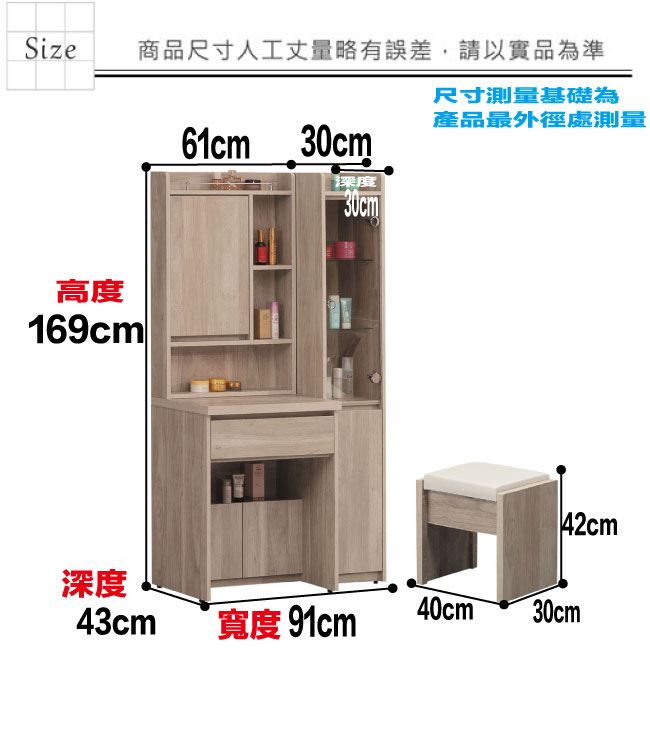 材質 | ◆產品名稱:【綠家居】曼特3尺開合式鏡台組合(二色可選+含化妝椅) 尺寸:(寬)91x(深)43(高)169/公分 ◆材質: 材質:防蛀木心板+五金滑軌結構+強化玻璃鏡面+防潮耐磨底座+防夾手緩衝門片五金 噴漆:防潮耐磨噴漆處理 |