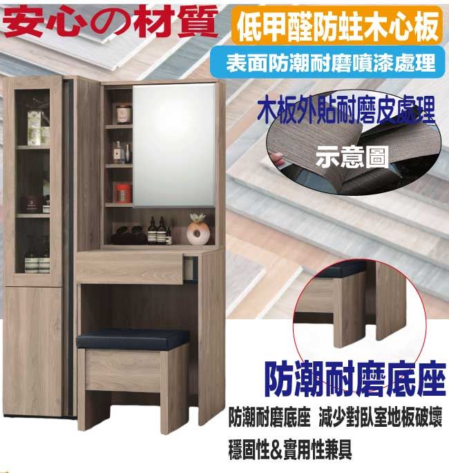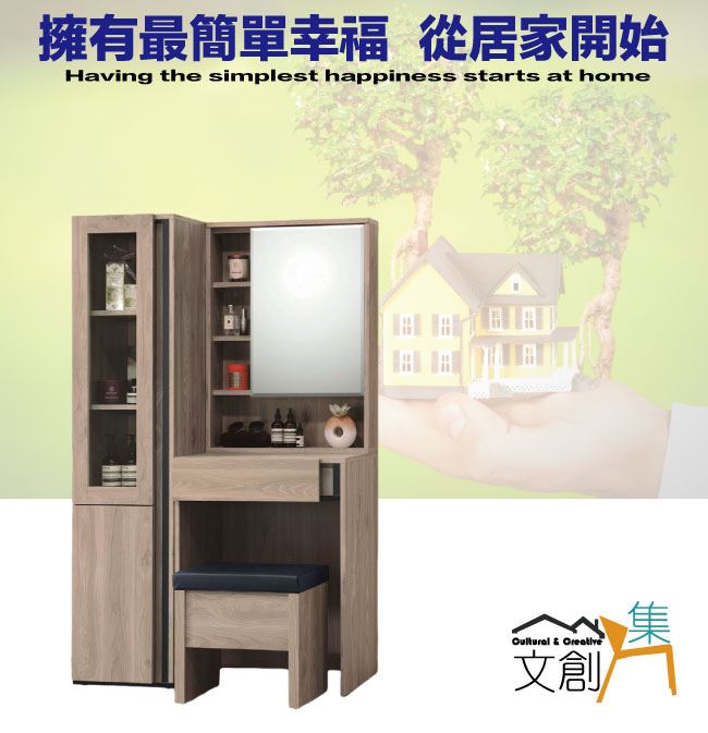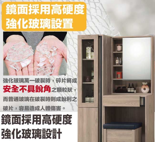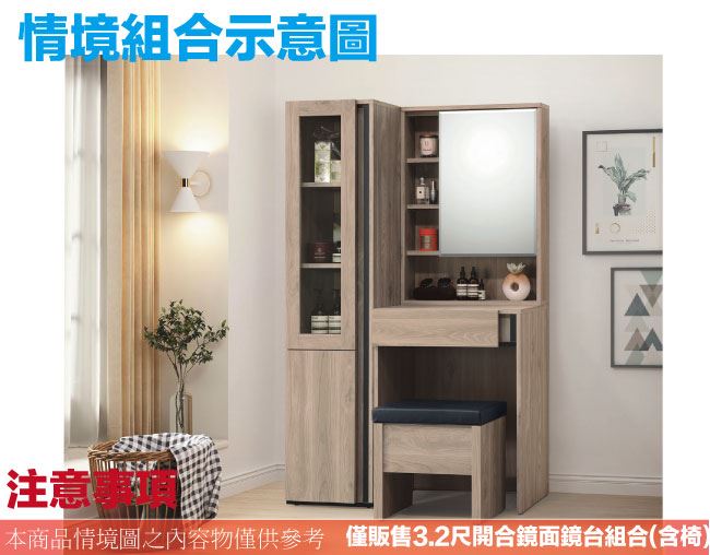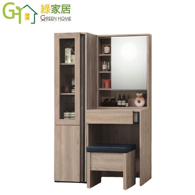 商 品 介 紹 | 【綠家居】安格3.2尺開合式鏡台組合(含化妝椅) 橡木紋色系+現代簡約風格+安心材質製造,使用放心+搭配居家更便利,整體採用防蛀木心板+五金滑軌結構+強化玻璃鏡面+防潮耐磨底座+防夾手緩衝門片五金等材質搭配外層採用防潮耐磨噴漆處理,採用開合式鏡面櫃+單抽屜+開門櫃+內&外開放收納層格等收納空間設計,全由專人配送到家,專業安心服務,替你省下更多時間! 【商品特色】 橡木紋色系+現代簡約風格+安心材質製造,使用放心+搭配居家更便利 此組鏡台組合含可收納化妝椅搭配,化妝椅座墊可掀起內含收納層格可用來置放私人物品,增加實用機能性 防蛀木心板+五金滑軌結構+強化玻璃鏡面+防潮耐磨底座+防夾手緩衝門片五金等材質 採用開合式鏡面櫃+單抽屜+開門櫃+內&外開放收納層格等收納空間設計 此商品不需要DIY組立,此商品為組立後之成品 品質保證、專業設計、貼心服務 全由專人配送到家,專業安心服務,替您省下更多時間