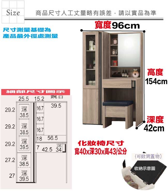 材質 | ◆產品名稱:【綠家居】安格3.2尺開合式鏡台組合(含化妝椅) 尺寸:(寬)96x(深)42(高)154/公分 ◆材質: 材質:防蛀木心板+五金滑軌結構+強化玻璃鏡面+防潮耐磨底座+防夾手緩衝門片五金 噴漆:防潮耐磨噴漆處理 |