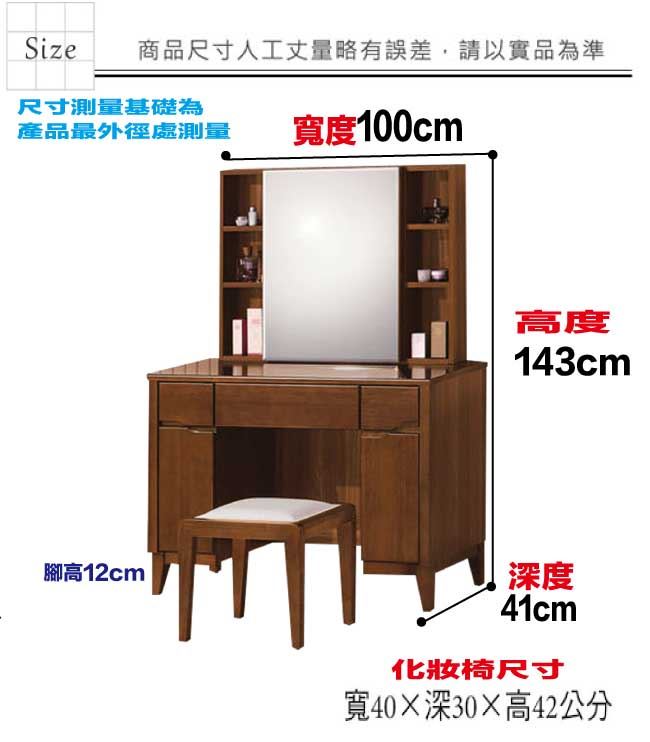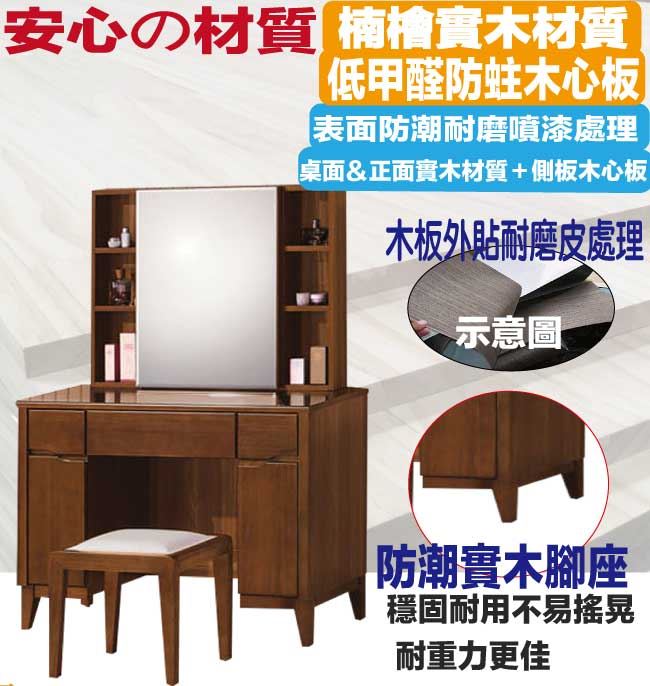 材質 | ◆產品名稱:【綠家居】胡立歐實木3.3尺側拉式鏡台組合(含化妝椅) 尺寸:(寬)100x(深)41(高)143/公分 ◆材質: 材質:楠檜實木+防蛀木心板+五金滑軌結構+強化玻璃鏡面+防潮實木底座+防夾手緩衝門片五金 噴漆:防潮耐磨噴漆處理 |