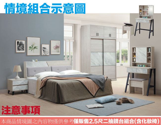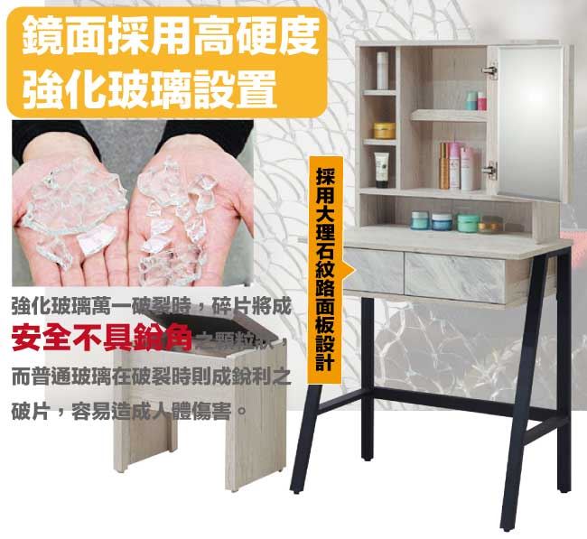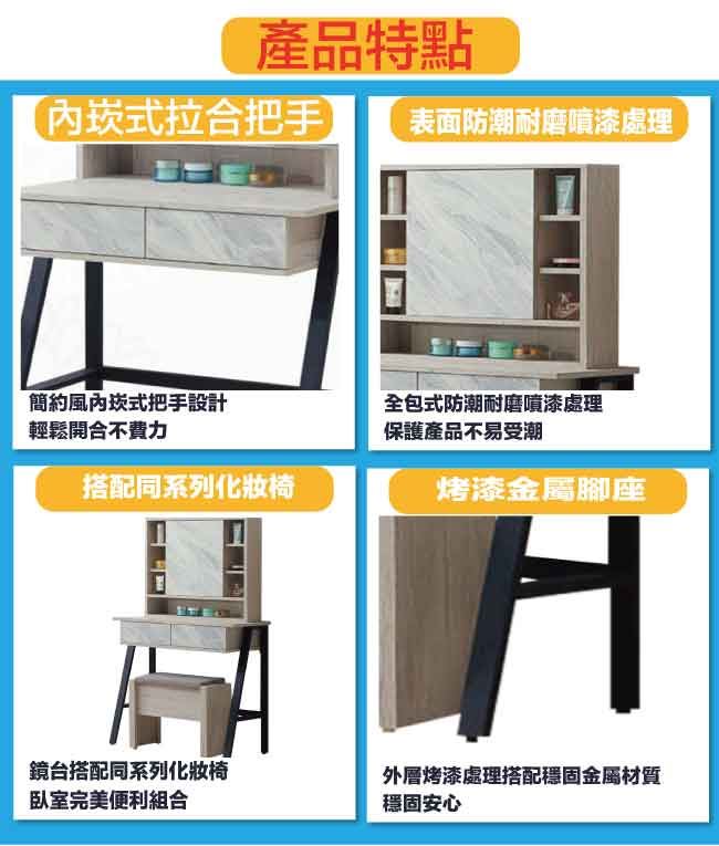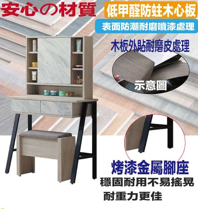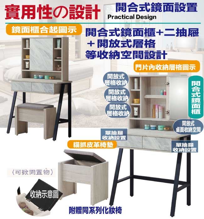 商 品 介 紹 | 【綠家居】蘿珊雙色2.6尺開合式鏡台組合(含化妝椅) 木紋雙色系+現代簡約風格+安心材質製造,使用放心+搭配居家更便利,整體採用防蛀木心板+五金滑軌結構+強化玻璃鏡面+烤漆金屬腳座等材質搭配外層採用防潮耐磨噴漆處理,採用開合式鏡面櫃+二抽屜+內&外開放層格等收納空間設計,全由專人配送到家,專業安心服務,替你省下更多時間! 【商品特色】 木紋雙色系+現代簡約風格+安心材質製造,使用放心+搭配居家更便利 此組鏡台組合含可收納化妝椅搭配,化妝椅座墊可掀起內含收納層格可用來置放私人物品,增加實用機能性 防蛀木心板+五金滑軌結構+強化玻璃鏡面+烤漆金屬腳座等材質 採用開合式鏡面櫃+二抽屜+內&外開放層格等收納空間設計 此商品不需要DIY組立,此商品為組立後之成品 品質保證、專業設計、貼心服務 全由專人配送到家,專業安心服務,替您省下更多時間