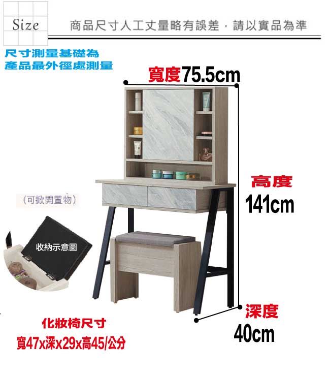 材質 | ◆產品名稱:【綠家居】蘿珊雙色2.6尺開合式鏡台組合(含化妝椅) 尺寸:(寬)75.5x(深)40x(高)141/公分 ◆材質: 材質:防蛀木心板+五金滑軌結構+強化玻璃鏡面+烤漆金屬腳座 噴漆:防潮耐磨噴漆處理 |
