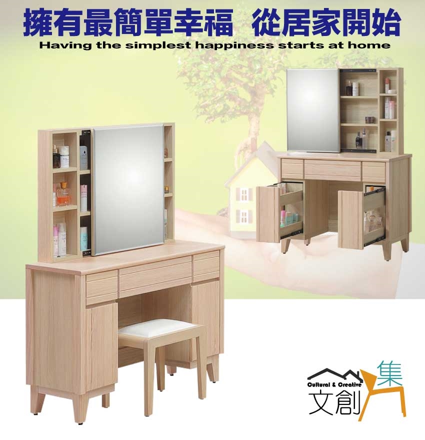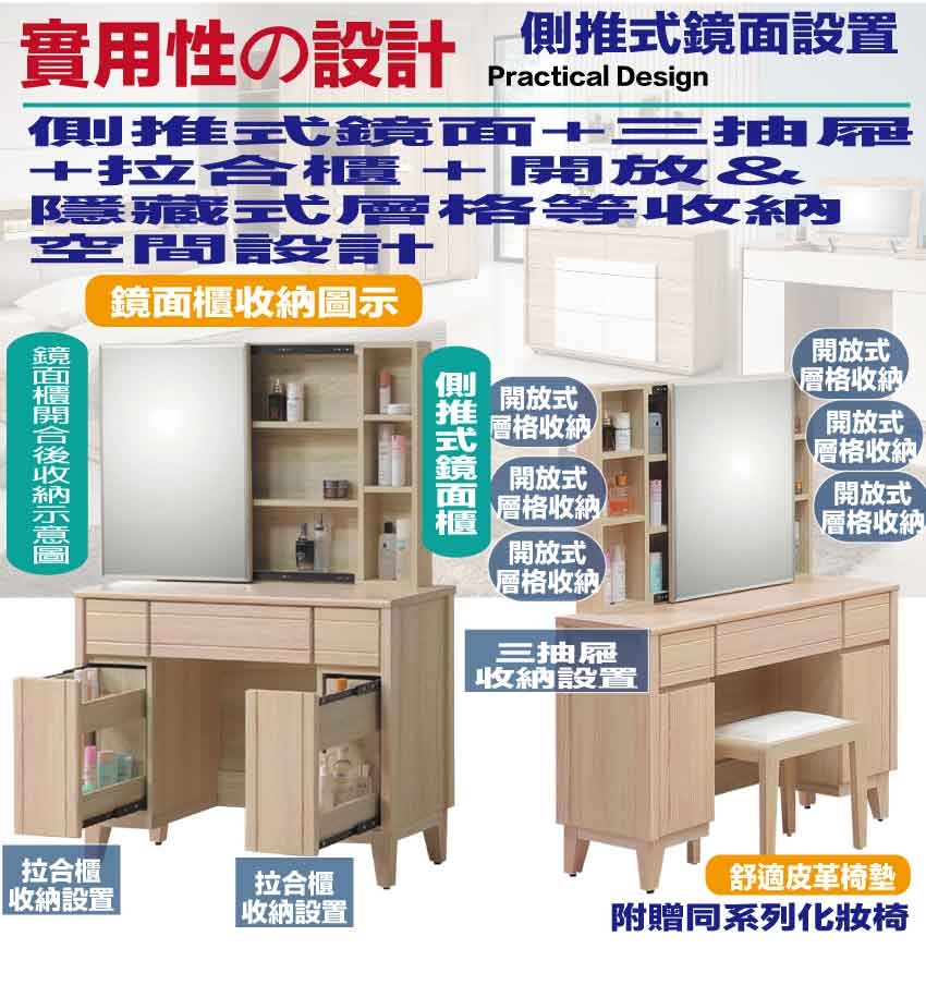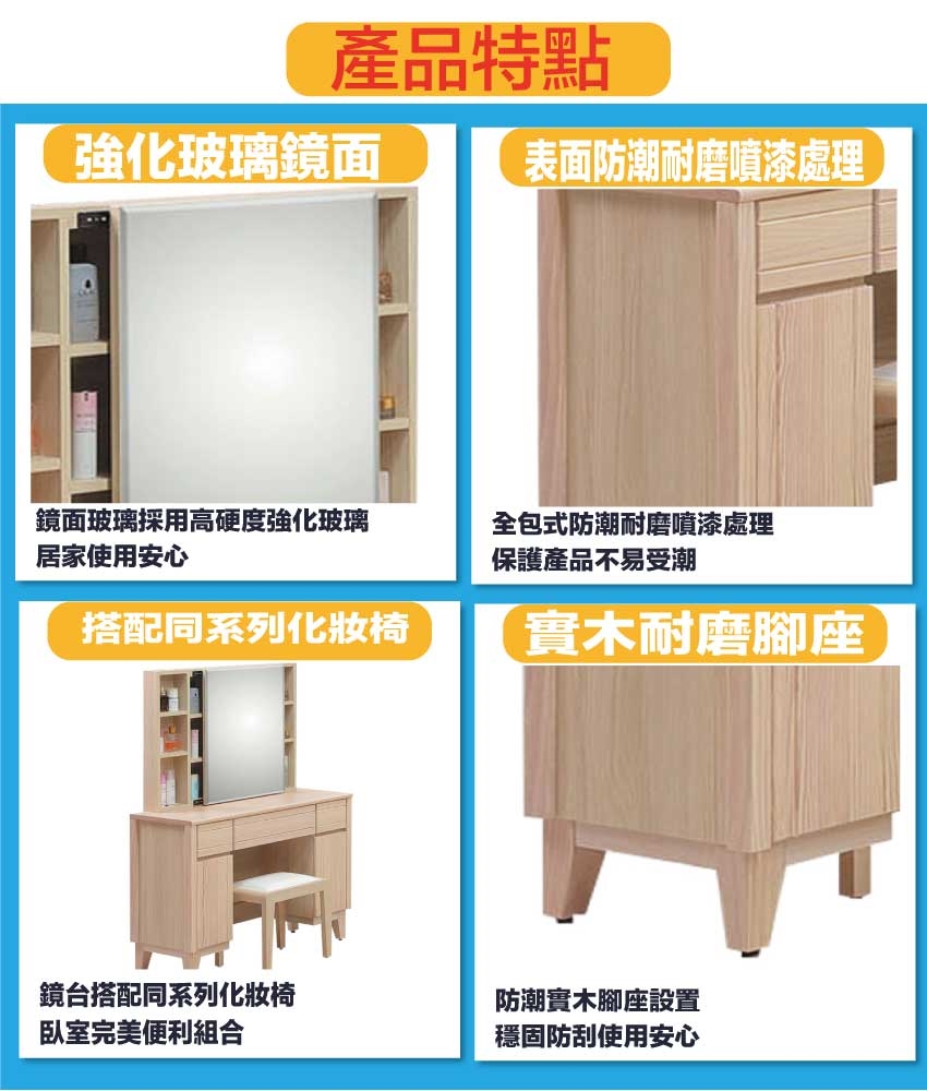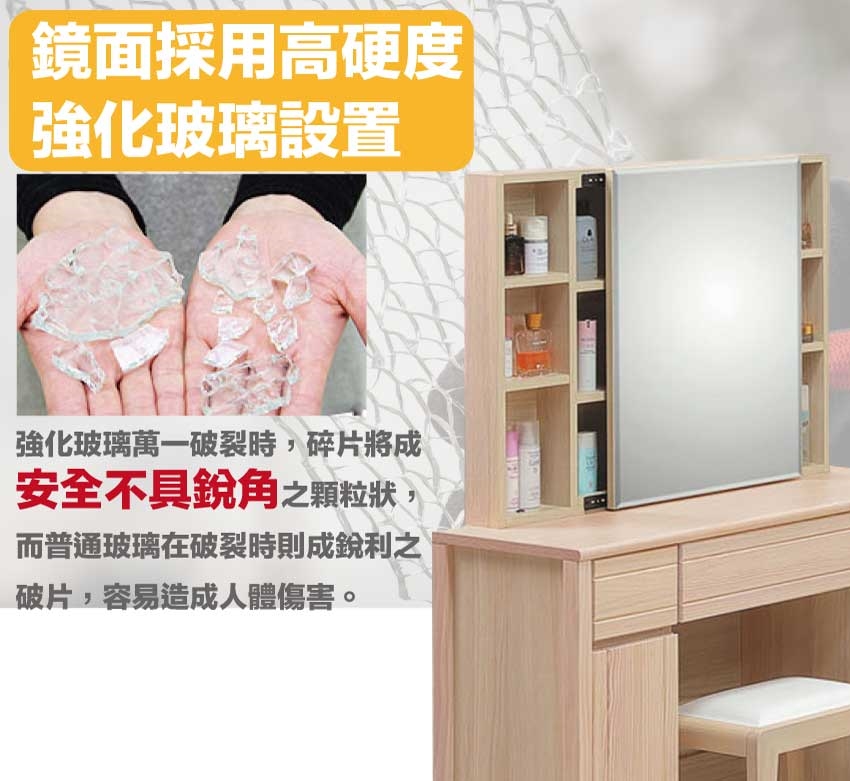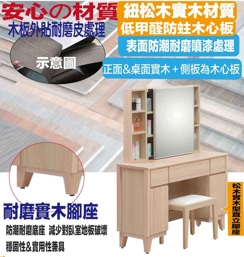 採用紐松木實木+防蛀木心板+防刮實木腳座++五金滑軌結構+強化玻璃鏡面+化妝椅實木腳座+透氣皮革坐墊等安心材質製造