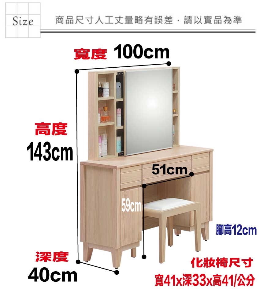 材質:紐松木實木+防蛀木心板+防刮實木腳座++五金滑軌結構+強化玻璃鏡面+化妝椅實木腳座+透氣皮革坐墊