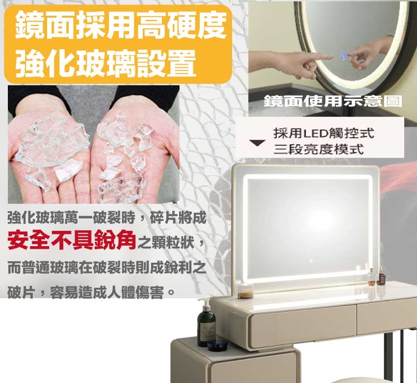 採用防潮MDF板+烤漆金屬腳座+強化玻璃鏡面+透氣柔韌皮革+高回彈泡棉+6mm高硬度岩板等安心材質製造