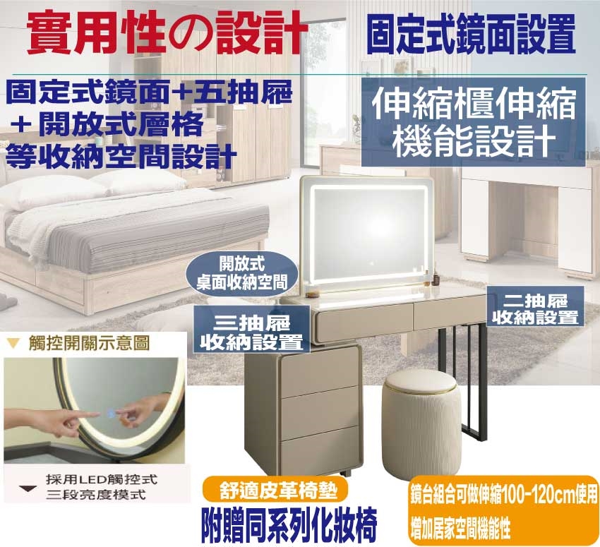 搭配採用固定觸控鏡面+五抽屜+內&外開放層格等收納空間設計