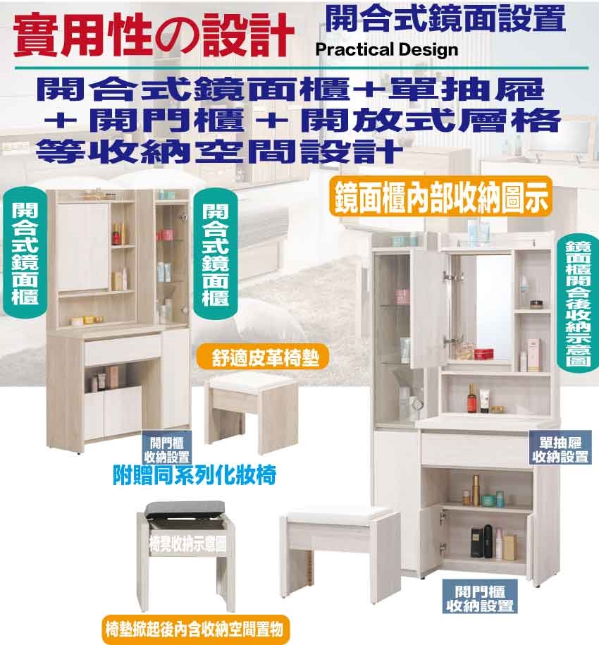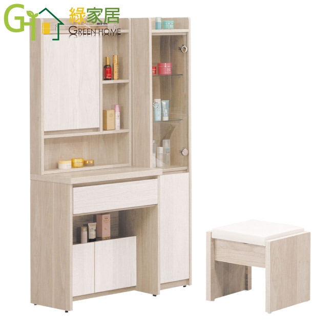- ◆產品名稱:【綠家居】雷克利雙色3尺開合鏡面鏡台/化妝台組合(鏡台+側邊櫃+含化妝椅)