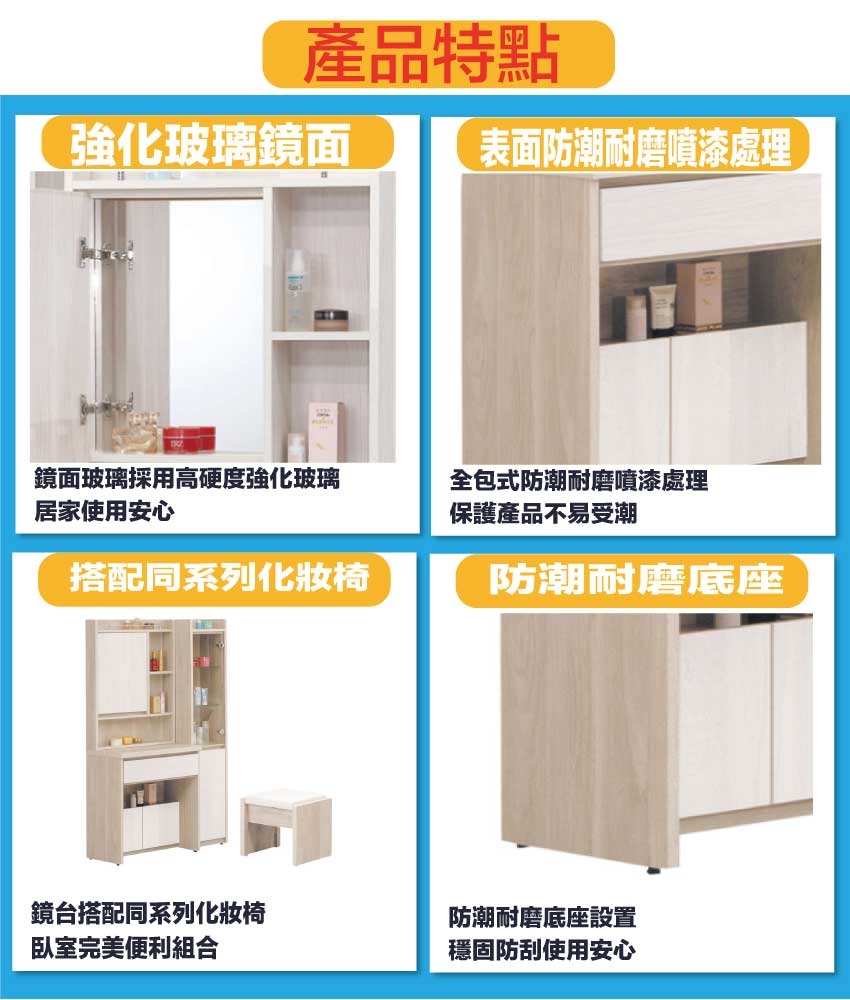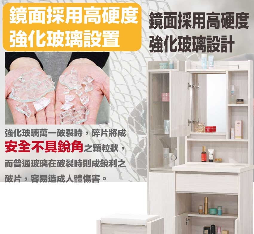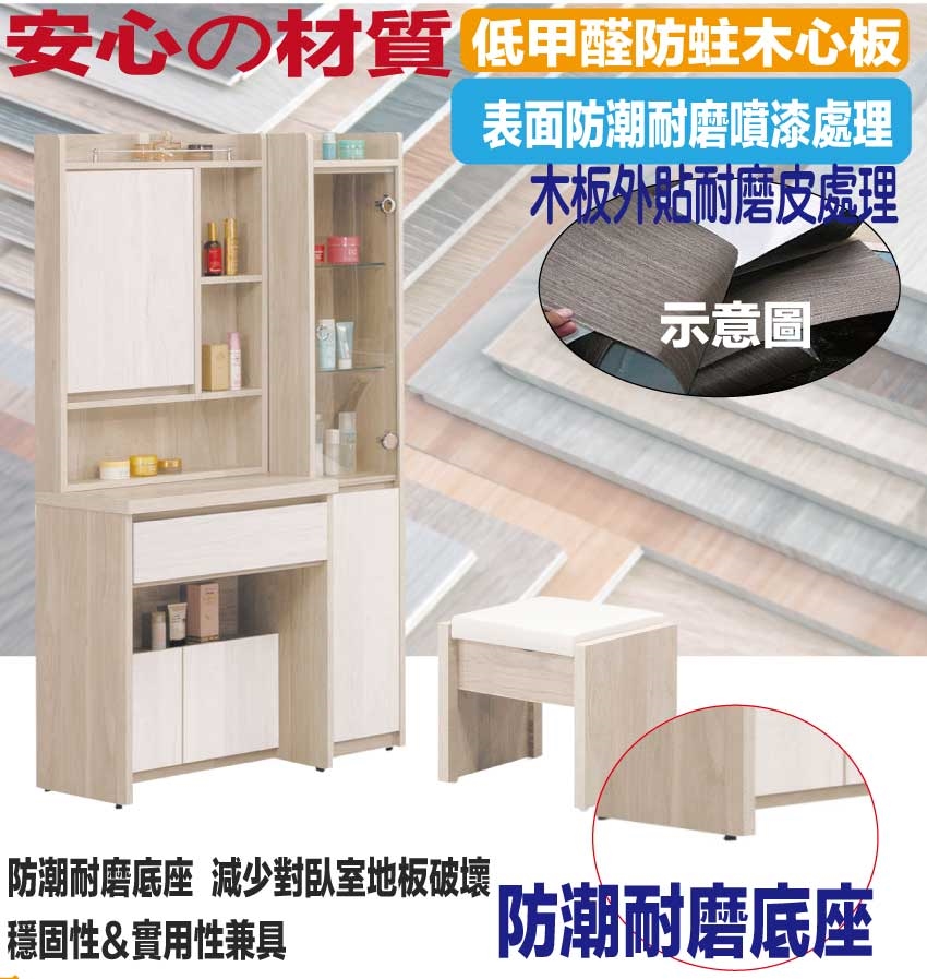 採用防蛀木心板+五金滑軌結構+強化玻璃鏡面+防潮耐磨底座等安心材質製造