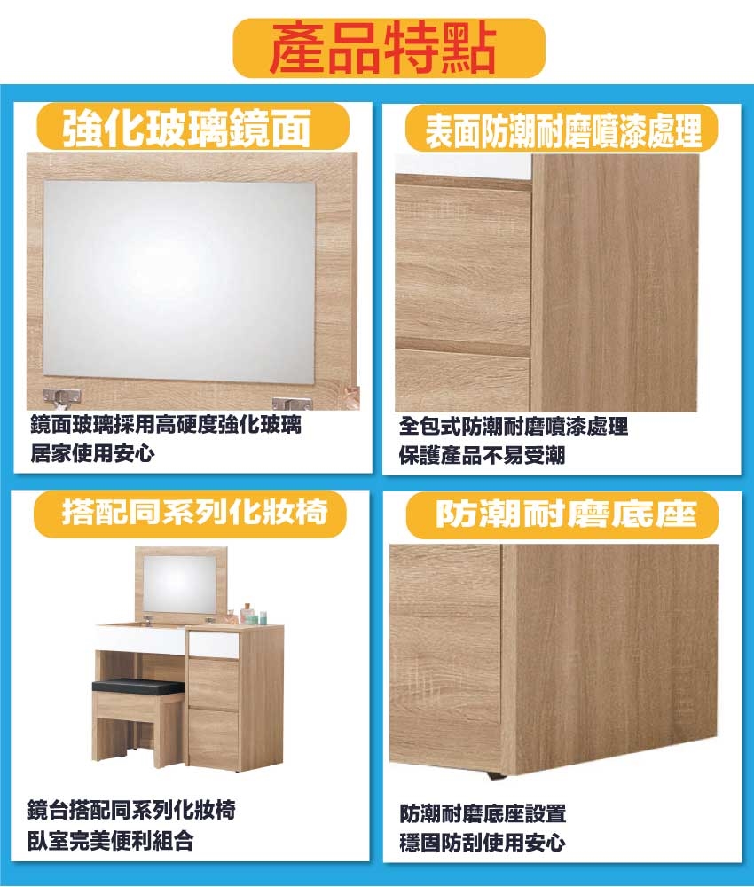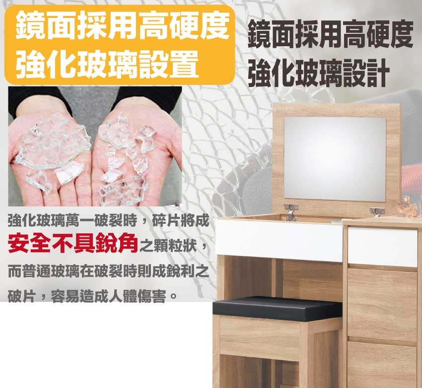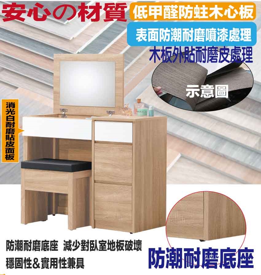 採用防蛀木心板+五金滑軌結構+強化玻璃鏡面+防潮耐磨底座等安心材質製造