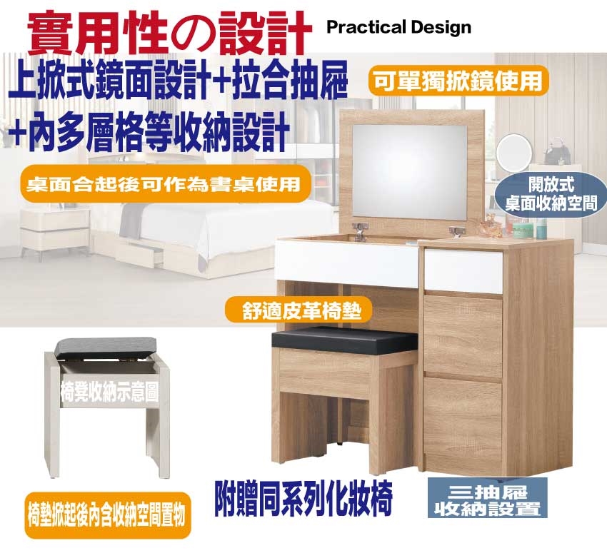 搭配採用上掀鏡面櫃+三抽屜+內&外開放層格等收納空間設計