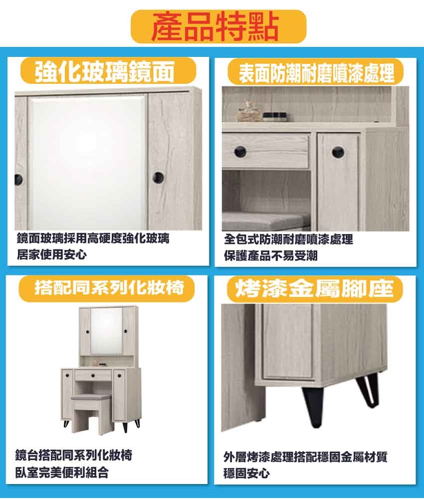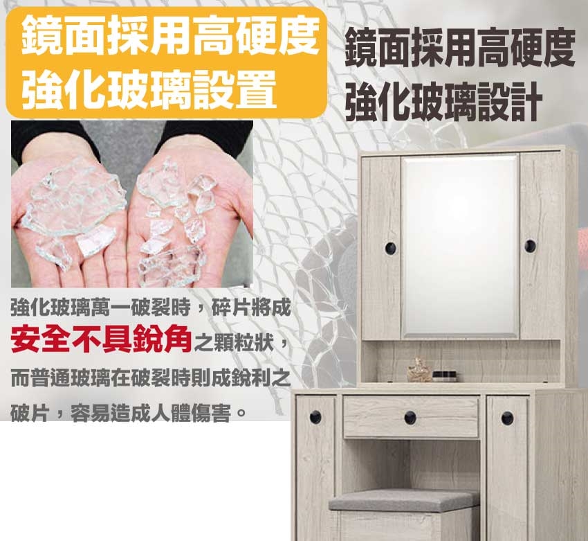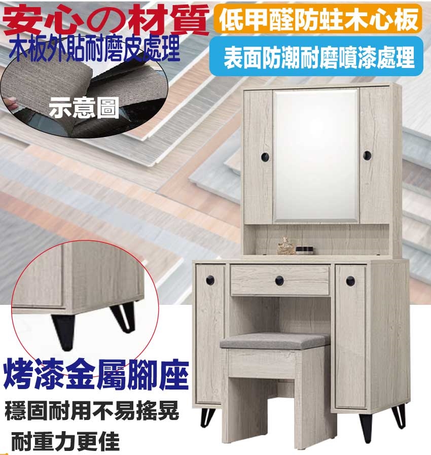 材質:防蛀木心板+烤漆金屬腳座+強化玻璃鏡面