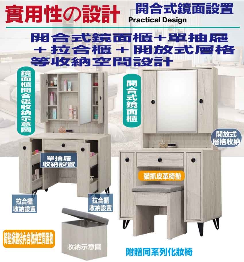 - ◆產品名稱:【綠家居】摩帝3尺開合式鏡面鏡台組合(含可收納化妝椅)