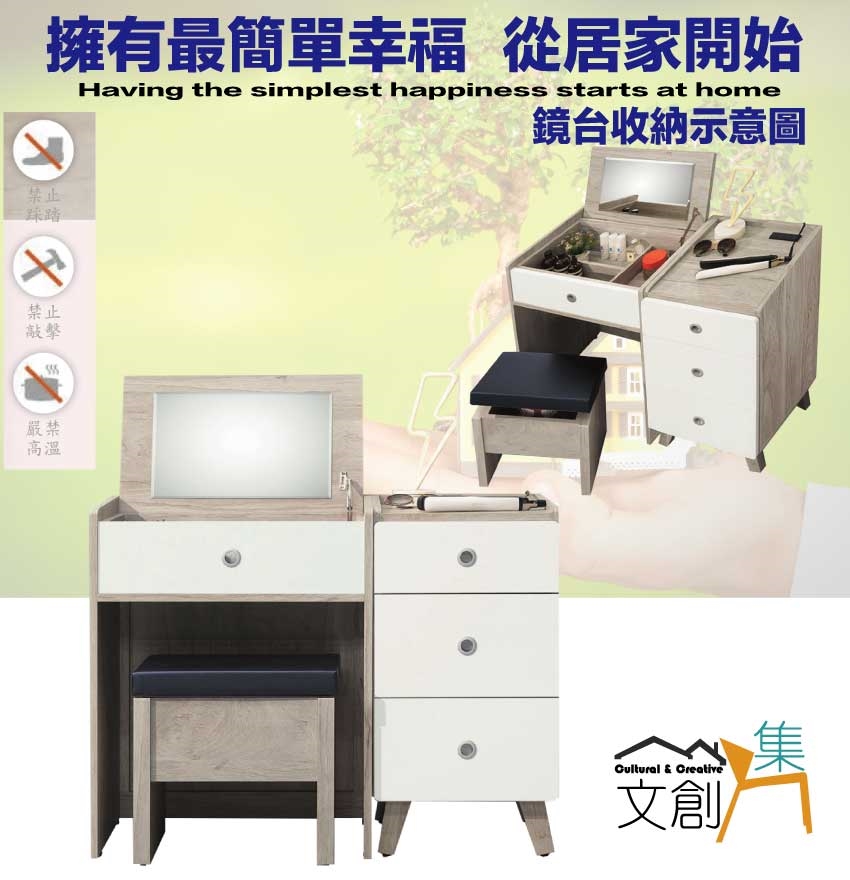 此鏡台搭配上掀鏡面即可收合化妝椅凳,收合後可作為收納櫃擺設,增加居家空間變化性