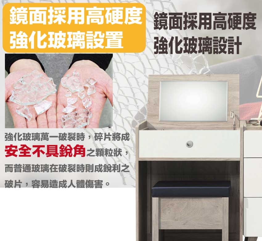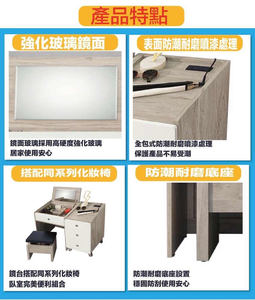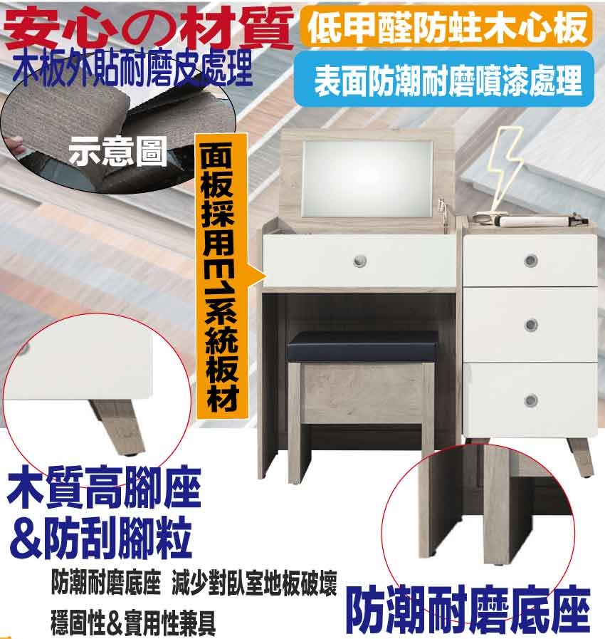 採用防蛀木心板+E1系統板材+木質高腳座&防刮腳粒+強化玻璃鏡面等安心材質製造