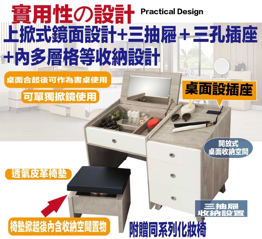 搭配採用上掀鏡面櫃+三抽屜+桌面便利插座設置+內&外開放層格等收納空間設計