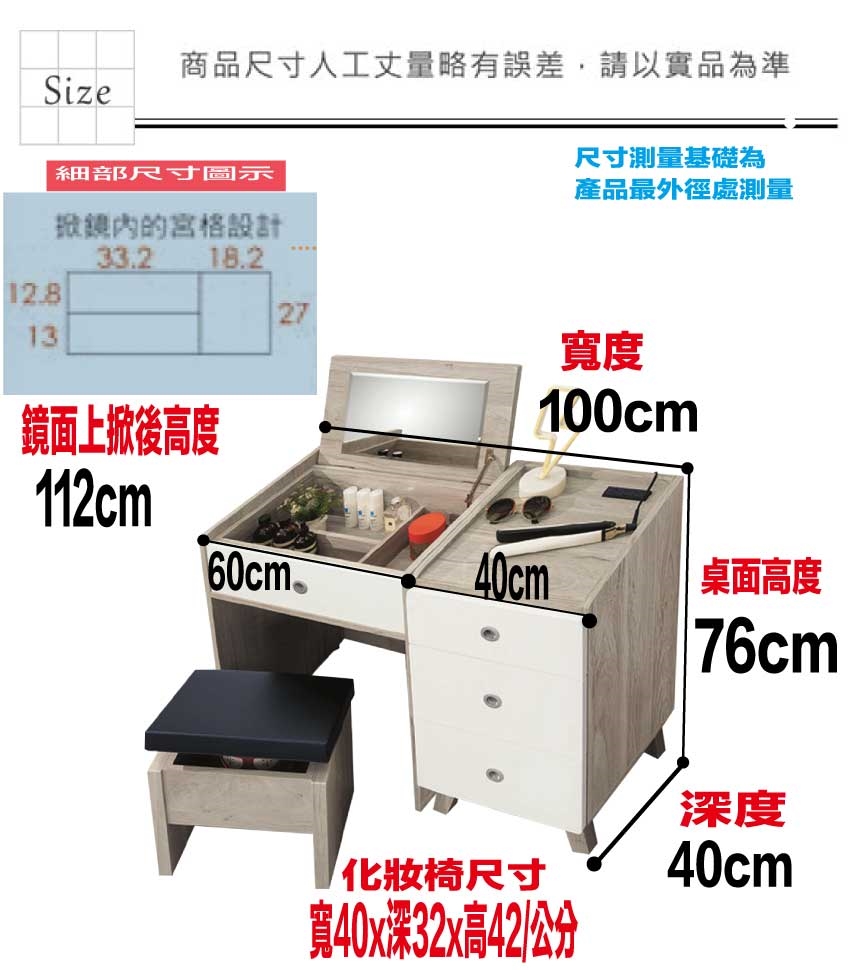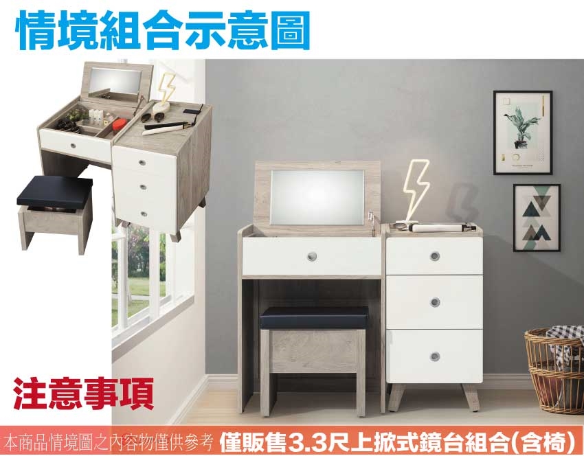- ◆產品名稱:【綠家居】克順雙色3.3尺上掀式鏡台/化妝台組合(含可收納化妝椅)