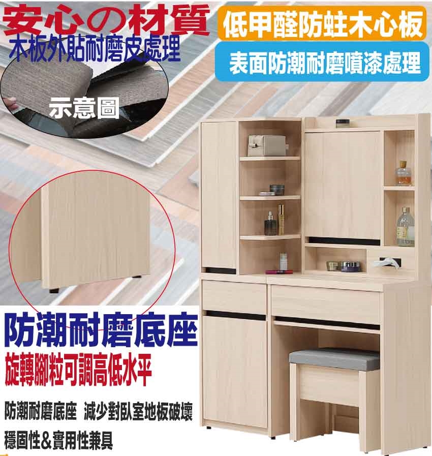 ★偏遠地區需額外加收運費,下標請先問與答詢問★ ★下訂前注意 由於商品流動較快,下訂前請先詢問是否有貨在下訂喔~★ 【綠家居】愛可3.3尺開合鏡面鏡台/化妝台組合(側邊櫃+鏡台+含可收納化妝椅) 木紋雙色系+安心材質製造,使用放心+搭配居家更便利,採用防蛀木心板+強化玻璃鏡面+防潮耐磨底座+防夾手緩衝門片五金等安心材質製造 ,外層採用防潮耐磨噴漆處理搭配採用開合鏡面櫃+拉合櫃+二抽屜+內&外開放層格等收納空間設計,全由專人配送到家,專業安心服務,替你省下更多時間!