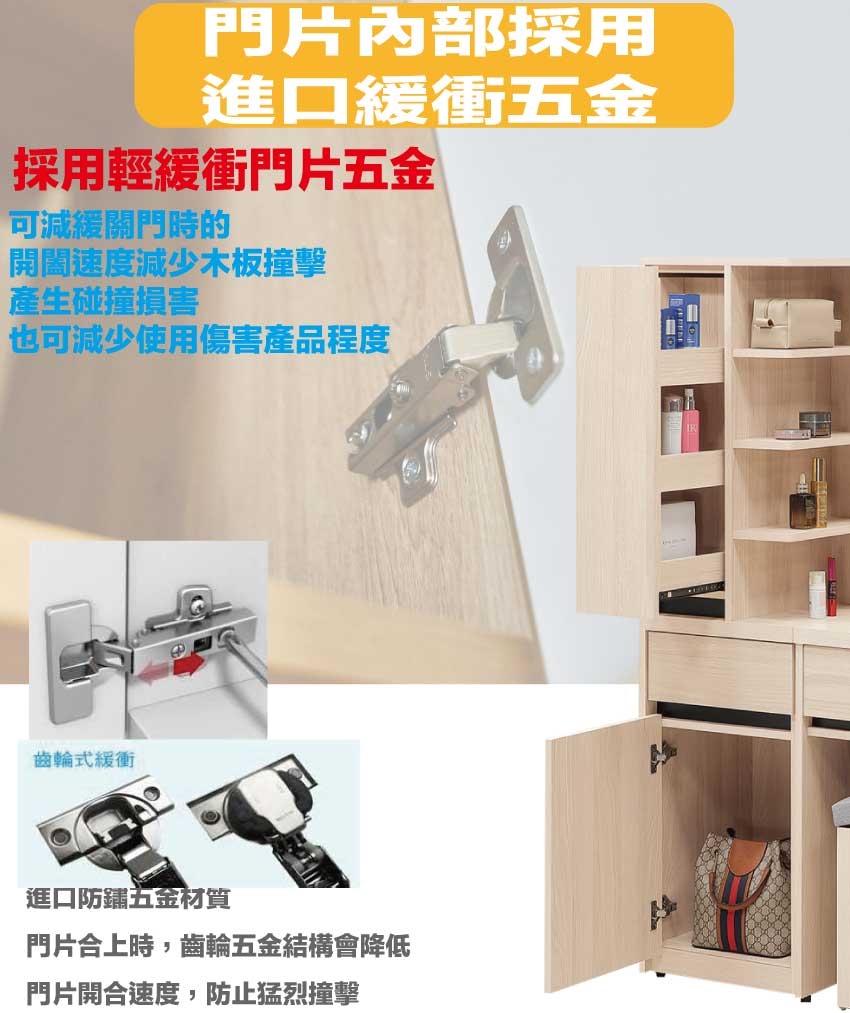 材質:防蛀木心板+強化玻璃鏡面+防潮耐磨底座+防夾手緩衝門片五金
