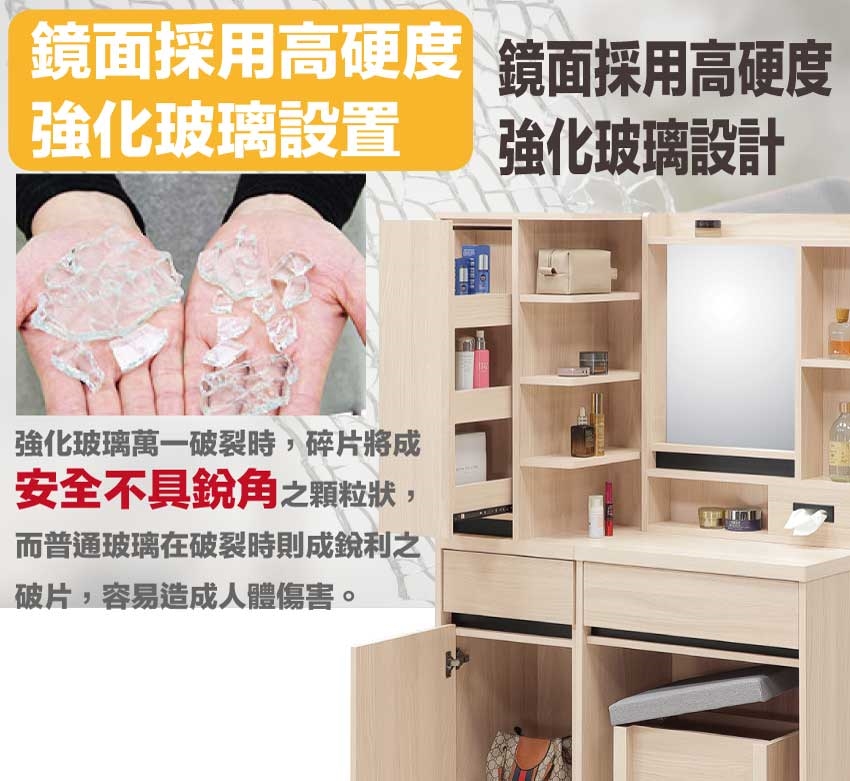 採用防蛀木心板+強化玻璃鏡面+防潮耐磨底座+防夾手緩衝門片五金等安心材質製造