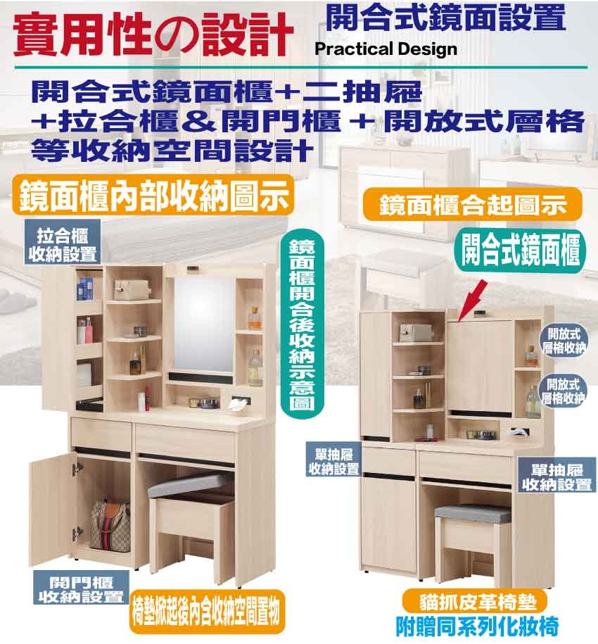 搭配採用開合鏡面櫃+拉合櫃+二抽屜+內&外開放層格等收納空間設計