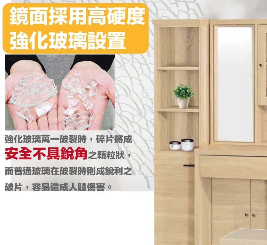 採用防蛀木心板+防潮耐磨底座+強化玻璃鏡面等安心材質製造