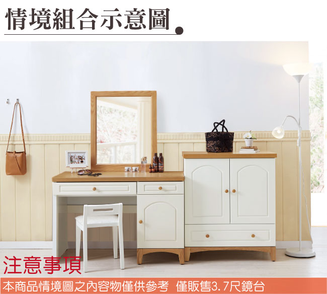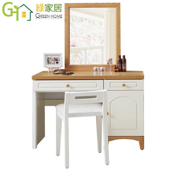 【綠家居】 布里斯 時尚3.7尺木紋雙色立鏡式化妝台組合(含化妝椅) 鏡台組合為防蛀木心板+防潮MDF板材+優利坦抗磨三層全包式塗漆塗裝+高硬度強化玻璃+鋼珠滑軌結構+時尚造型把手等材質耐用堅固,鏡台組合為雙抽屜+開門櫃+開放式桌面等多功能的可收納空間結構,讓您不必再頭痛地整理桌上的瓶瓶罐罐,滿足您的各種收納需求。 現在購買專人送到府服務,免組裝,讓你省時省力省運費!