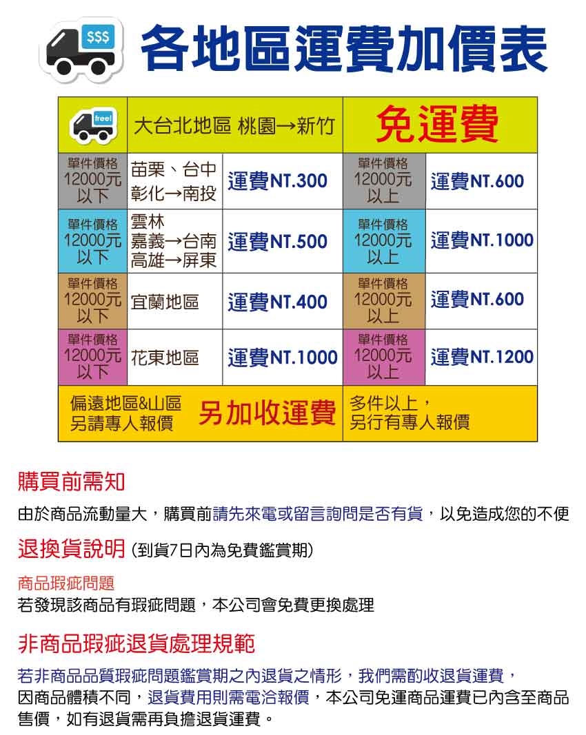 1.實因特殊地型限制及(山區、濱海鄉、鎮、村、區)無法送貨時,本公司保有出貨與否之權利(下單後會由專人告知是否可配送)。