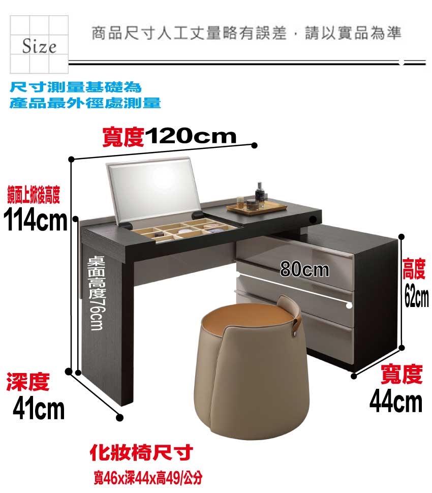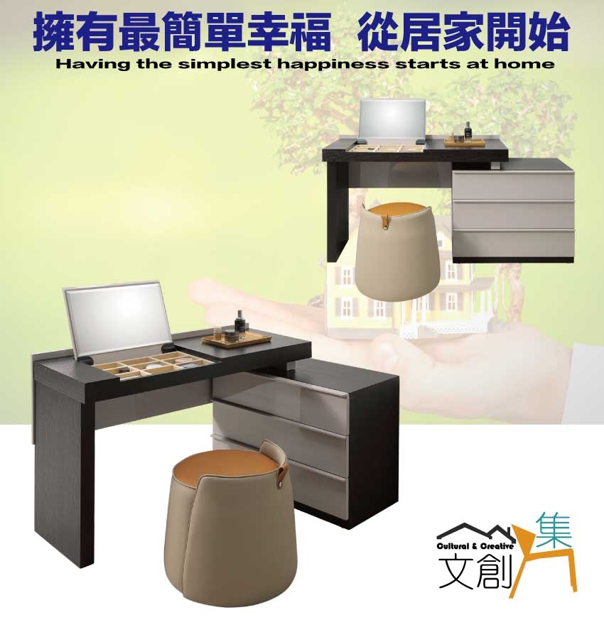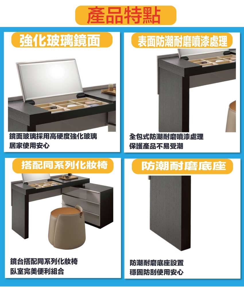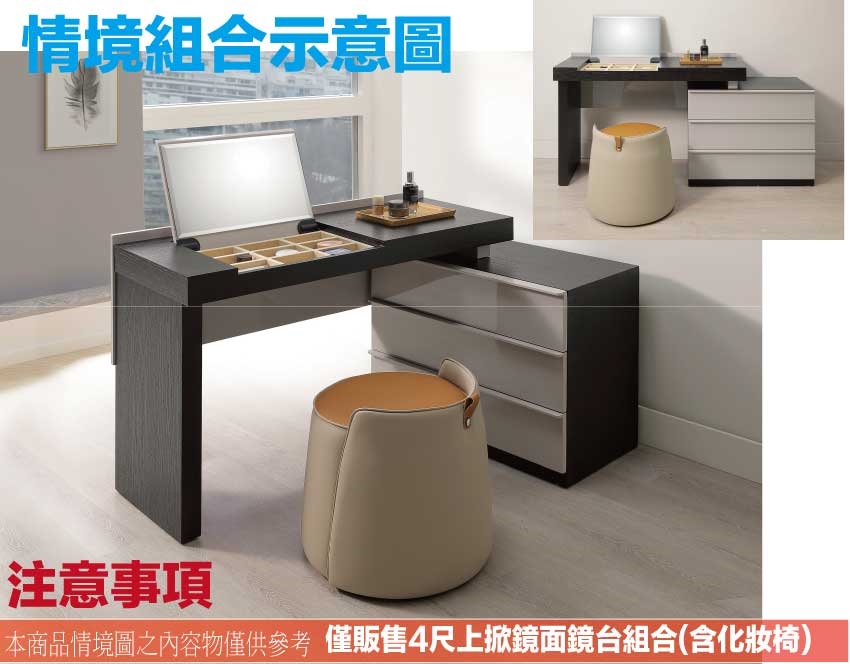 - ◆產品名稱:【綠家居】墨古4尺雙色伸縮上掀鏡面鏡台組合(含化妝椅)