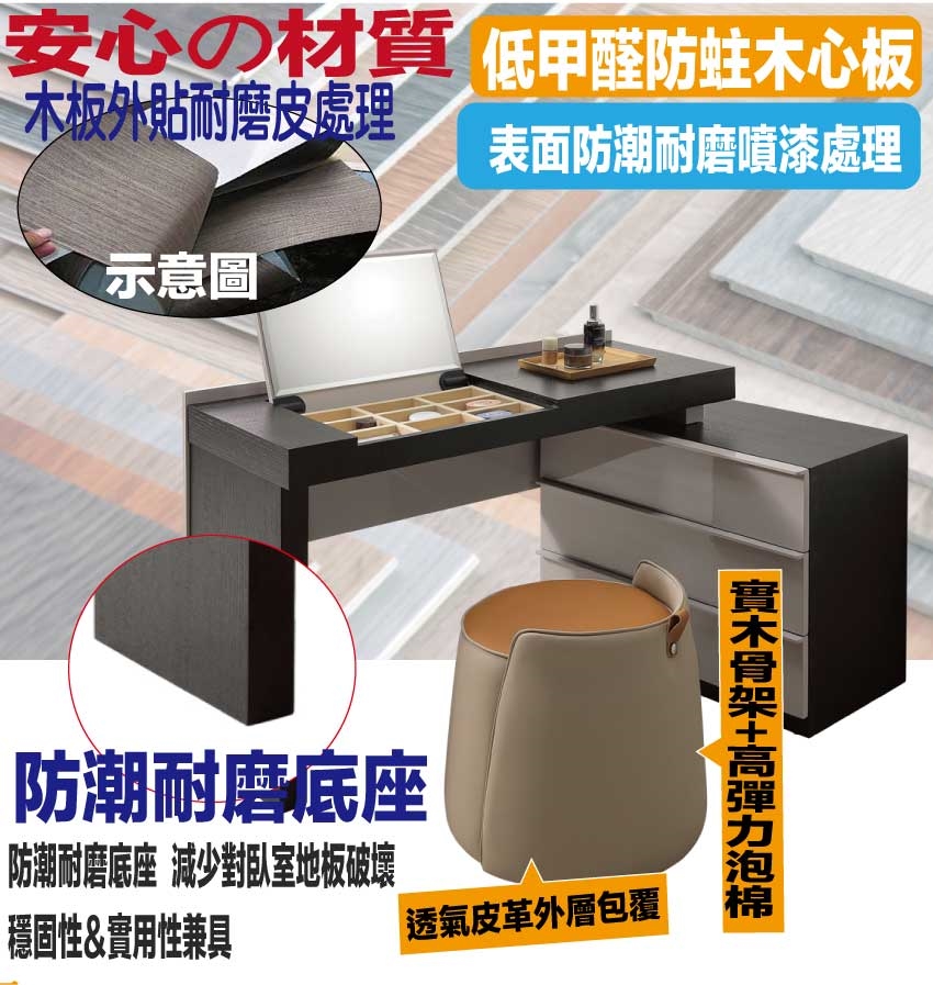 採用防蛀木心板+防潮耐磨底座+強化玻璃鏡面+透氣柔韌皮革+高回彈泡棉等安心材質製造