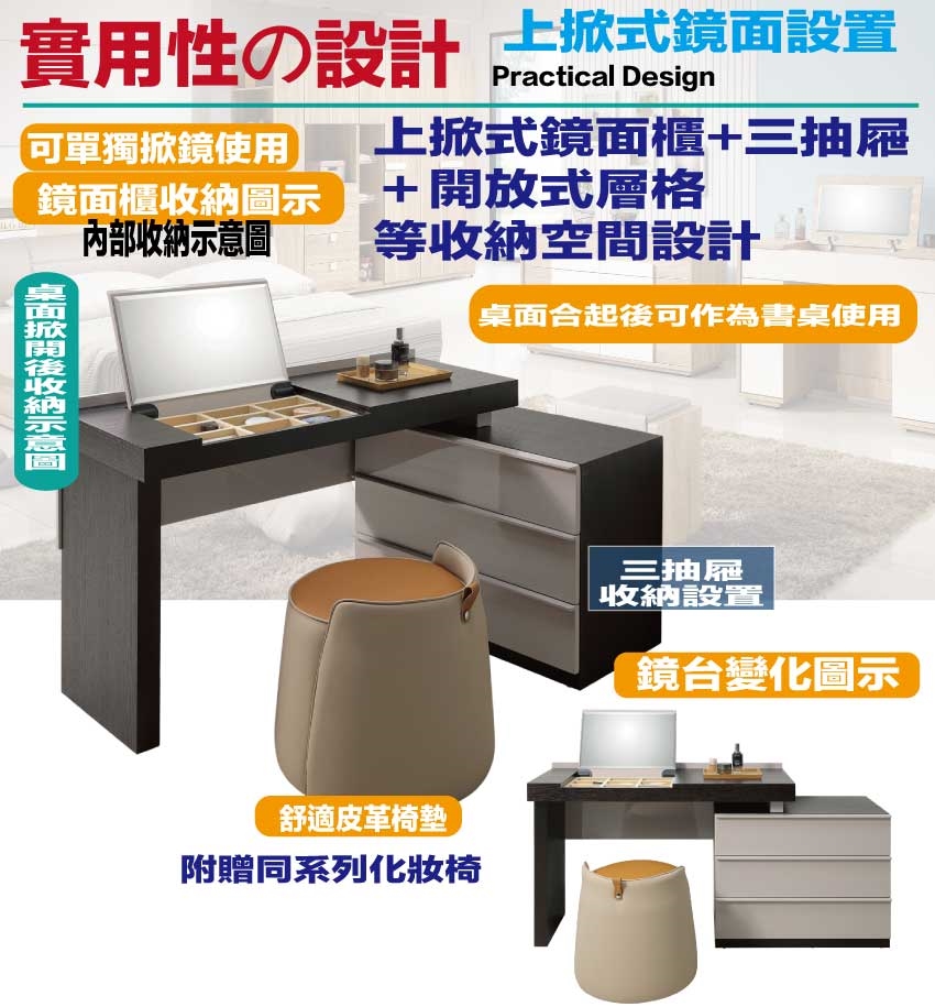 搭配採用上掀鏡面櫃+三抽屜+內&外開放層格等收納空間設計