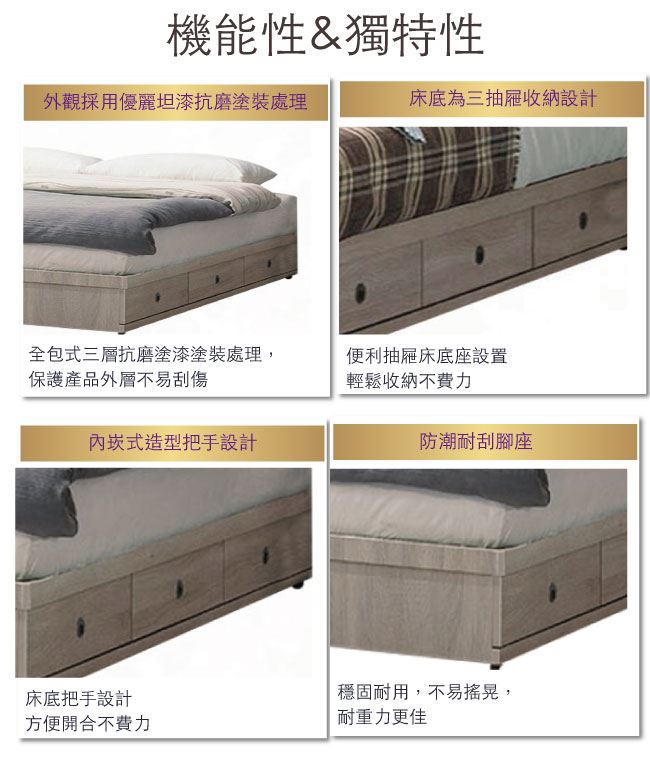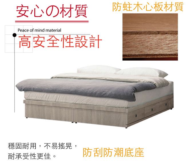 商品介紹 | 【綠家居】愛德華 現代6尺雙人加大三抽床底(不含床墊) 橡木紋色系+現代簡約風格+安心材質製造,整體採用防蛀木心板+六分木床板等安心材質製造,外層採用優利坦全包式耐磨噴漆處理搭配採用單邊開合三抽屜床底置便利設計,全由專人配送到家,專業安心服務,替你省下更多時間! 【商品特色】 橡木紋色系+現代簡約風格+安心材質製造,使用放心+搭配居家更便利 採用防蛀木心板+六分木床板等安心材質製造 採用單邊開合三抽屜床底置便利設計 此商品不需要DIY組立,此商品為組立後之成品 品質保證、專業設計、貼心服務 全由專人配送到家,專業安心服務,替您省下更多時間 |
