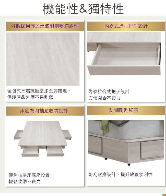 商品介紹 | 【綠家居】蓋爾達 現代5尺雙人四抽床底(不含床墊) 橡木紋色系+現代簡約風格+安心材質製造,整體採用防蛀木心板+耐磨防潮底座+六分木床板等安心材質製造,外層採用優利坦全包式耐磨噴漆處理搭配採用三邊開合四抽屜便利收納設計,全由專人配送到家,專業安心服務,替你省下更多時間! 【商品特色】 橡木紋色系+現代簡約風格+安心材質製造,使用放心+搭配居家更便利 採用防蛀木心板+耐磨防潮底座+六分木床板等安心材質製造 採用三邊開合四抽屜便利收納設計 此商品不需要DIY組立,此商品為組立後之成品 品質保證、專業設計、貼心服務 全由專人配送到家,專業安心服務,替您省下更多時間 |
