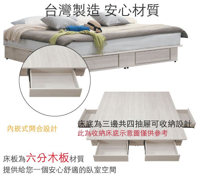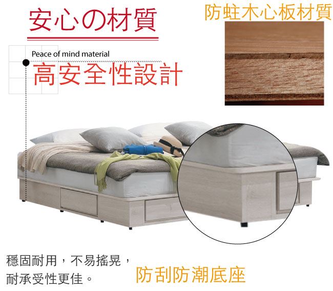 商品介紹 | 【綠家居】蓋爾達 現代6尺雙人加大四抽床底(不含床墊) 橡木紋色系+現代簡約風格+安心材質製造,整體採用防蛀木心板+耐磨防潮底座+六分木床板等安心材質製造,外層採用優利坦全包式耐磨噴漆處理搭配採用三邊開合四抽屜便利收納設計,全由專人配送到家,專業安心服務,替你省下更多時間! 【商品特色】 橡木紋色系+現代簡約風格+安心材質製造,使用放心+搭配居家更便利 採用防蛀木心板+耐磨防潮底座+六分木床板等安心材質製造 採用三邊開合四抽屜便利收納設計 此商品不需要DIY組立,此商品為組立後之成品 品質保證、專業設計、貼心服務 全由專人配送到家,專業安心服務,替您省下更多時間 |
