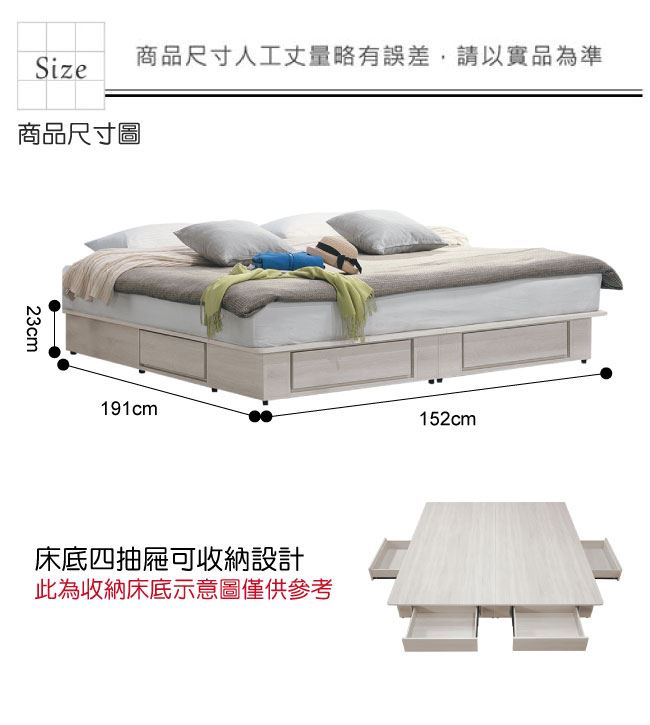 材質 | ◆產品名稱:【綠家居】蓋爾達 現代6尺雙人加大四抽床底(不含床墊) 產品尺寸: 尺寸:(寬)182x(深)191x(高)23/公分 ◆材質: 材質:防蛀木心板+耐磨防潮底座+六分木床板 塗漆:優利坦全包式耐磨噴漆處理 |