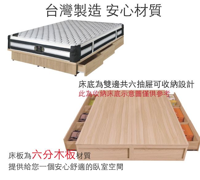 材質 | ◆產品名稱: 【綠家居】查摩 橡木紋5尺雙人六抽床底(不含床墊) 床底尺寸:(寬)151x(深)187高)25分 ◆材質: 材質:防蛀木心板+六分木床板+防刮耐磨腳座 噴漆:防潮耐磨噴漆處理