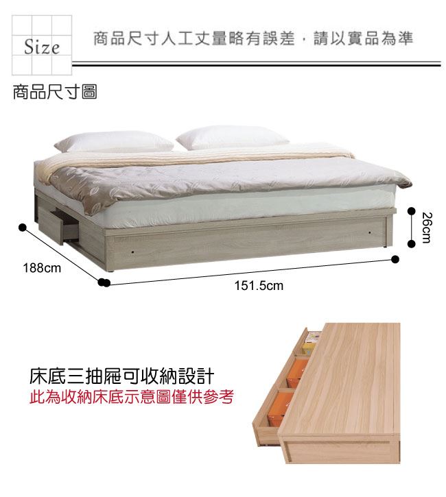 材質 | ◆產品名稱: 【綠家居】歐倫勒 現代5尺雙人三抽床底(不含床墊) 產品尺寸: 床底尺寸:(寬)151.5x(深)188x(高)26/公分 ◆材質: 材質:防蛀木心板+六分木床板+防潮耐磨底座 塗漆:優利坦全包式耐磨噴漆處理