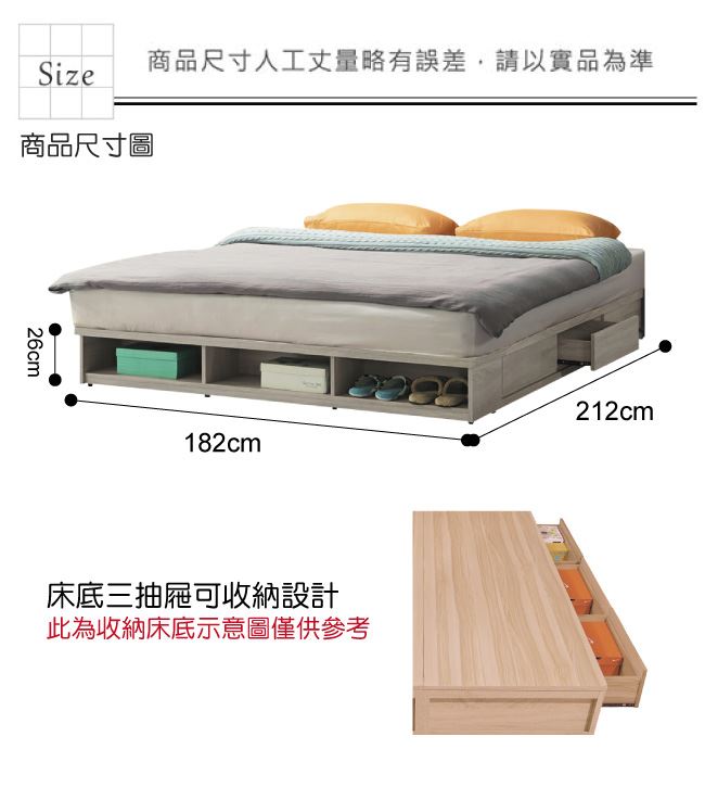 材質 | ◆產品名稱: 【綠家居】歐倫勒 現代6*7尺雙人加大三抽床底(不含床墊) 產品尺寸: 床底尺寸:(寬)182x(深)212x(高)26/公分 ◆材質: 材質:防蛀木心板+六分木床板+防潮耐磨底座 塗漆:優利坦全包式耐磨噴漆處理