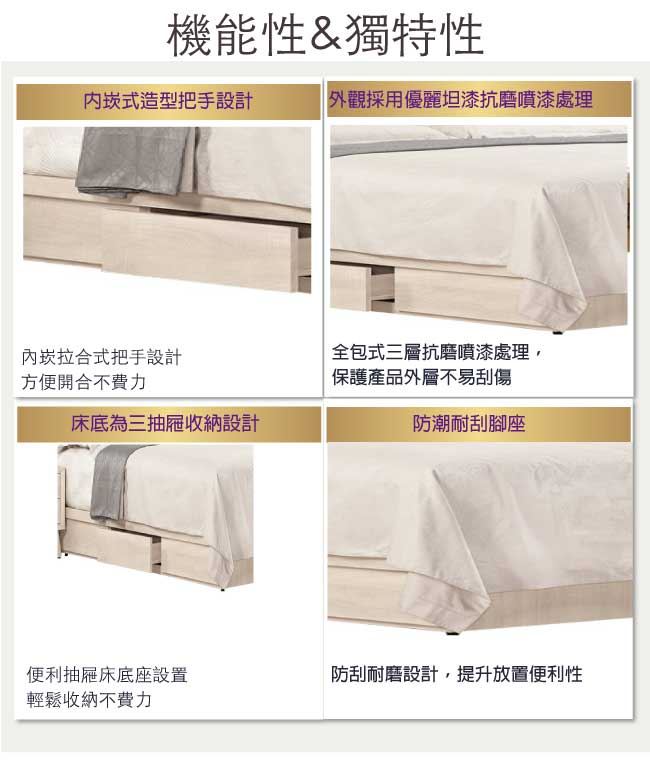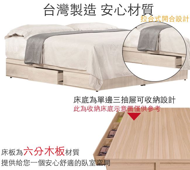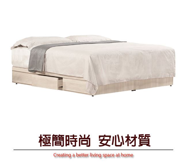 商品介紹 | 【綠家居】畢娜 橡木紋6尺雙人加大三抽床底(不含床墊) 橡木紋色系+現代簡約風格+安心材質製造,整體採用防蛀木心板+六分木床板+防潮耐磨腳座等安心材質製造,產品外層採用防潮耐磨噴漆處理搭配採用單邊開合三抽屜床底收納空間設計,全由專人配送到家,專業安心服務,替你省下更多時間! 【商品特色】 橡木紋色系+現代簡約風格+安心材質製造,使用放心+搭配居家更便利 採用防蛀木心板+六分木床板+防潮耐磨腳座等安心材質製造 產品外層採用防潮耐磨噴漆處理 搭配採用單邊開合三抽屜床底收納空間設計 此商品不需要DIY組立,此商品為組立後之成品 品質保證、專業設計、貼心服務 全由專人配送到家,專業安心服務,替您省下更多時間 |