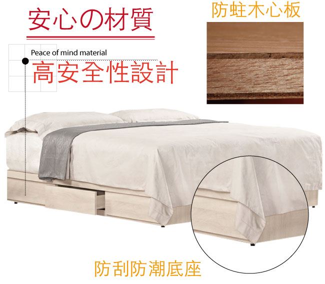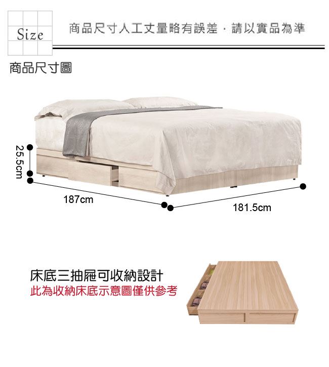 材質 | ◆產品名稱: 【綠家居】畢娜 橡木紋6尺雙人加大三抽床底(不含床墊) 床底尺寸:(寬)181.5x(深)187高)25.5分 ◆材質: 材質:防蛀木心板+六分木床板+防潮耐磨腳座 噴漆:防潮耐磨噴漆處理