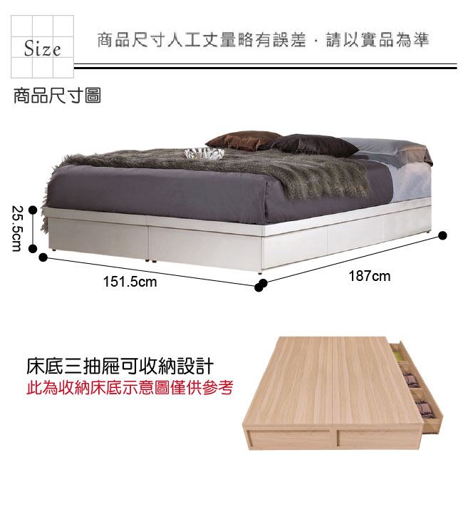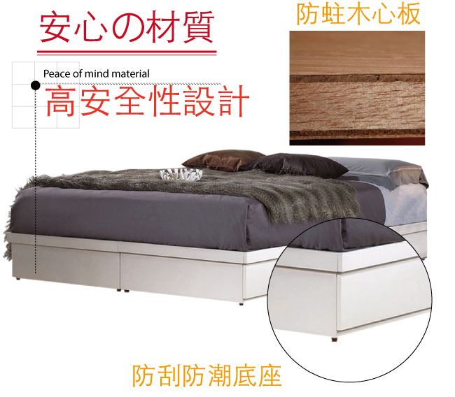 材質 | ◆產品名稱: 【綠家居】律法瑪 現代白5尺雙人三抽床底(不含床墊) 床底尺寸:(寬)151.5x(深)187(高)25.5分 ◆材質: 材質:防蛀木心板+六分木床板+防潮耐磨腳座 噴漆:防潮亮面噴漆處理