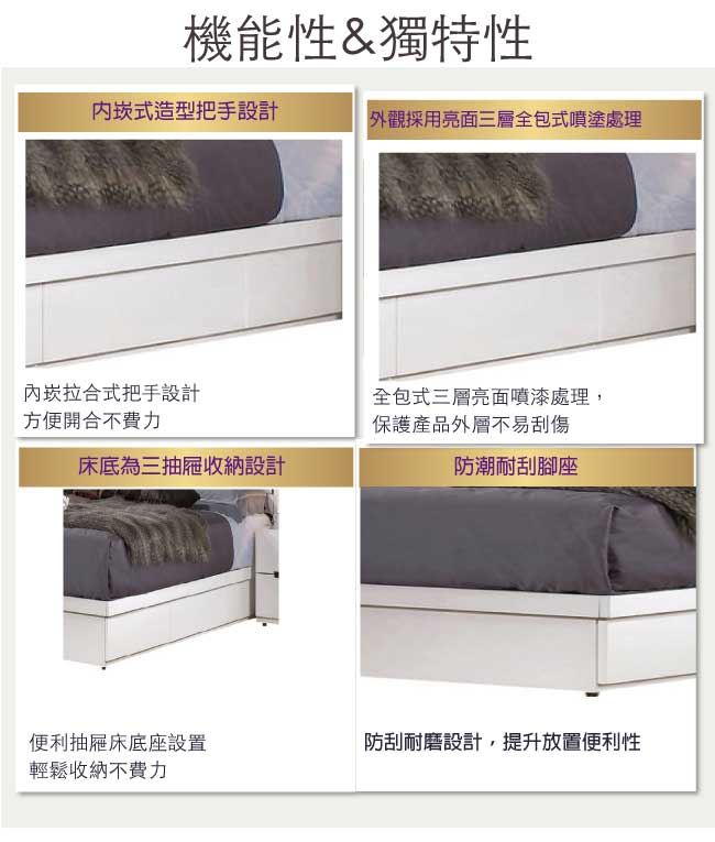 商品 介紹 | 【綠家居】律法瑪 現代白5尺雙人三抽床底(不含床墊) 現代白色系+現代簡約風格+安心材質製造,整體採用防蛀木心板+六分木床板+防潮耐磨腳座等安心材質製造,產品外層採用防潮亮面噴漆處理搭配採用單邊開合三抽屜床底收納空間設計,全由專人配送到家,專業安心服務,替你省下更多時間! 【商品特色】 現代白色系+現代簡約風格+安心材質製造,使用放心+搭配居家更便利 採用防蛀木心板+六分木床板+防潮耐磨腳座等安心材質製造 產品外層採用防潮亮面噴漆處理 搭配採用單邊開合三抽屜床底收納空間設計 此商品不需要DIY組立,此商品為組立後之成品 品質保證、專業設計、貼心服務 全由專人配送到家,專業安心服務,替您省下更多時間 |