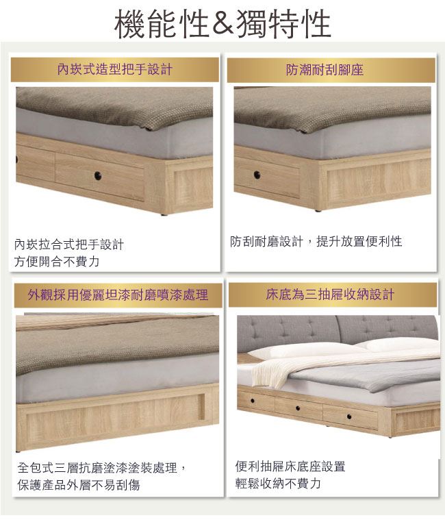 商品 介紹 | 【綠家居】科羅利 現代5尺雙人三抽床底(不含床墊) 橡木紋色系+現代簡約風格+安心材質製造,整體採用防蛀木心板+透氣亞麻布+高密度泡棉+六分木床板+防潮耐磨底座等安心材質製造,外層採用優利坦全包式耐磨噴漆處理搭配採用單邊開合收納三抽屜便利設計,全由專人配送到家,專業安心服務,替你省下更多時間! 【商品特色】 橡木紋色系+現代簡約風格+安心材質製造,使用放心+搭配居家更便利 採用防蛀木心板+六分木床板+防潮耐磨底座等安心材質製造 採用單邊開合收納三抽屜等便利設計 此商品不需要DIY組立,此商品為組立後之成品 品質保證、專業設計、貼心服務 全由專人配送到家,專業安心服務,替您省下更多時間 |