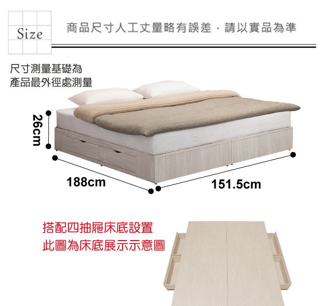 材質 | ◆產品名稱: 【綠家居】古利德 現代5尺雙人四抽床底(不含床墊) 產品尺寸: 床底尺寸:(寬)151.5x(深)188x(高)26/公分 ◆材質: 材質:防蛀木心板+六分木床板+防潮耐磨底座 塗漆:優利坦全包式耐磨噴漆處理