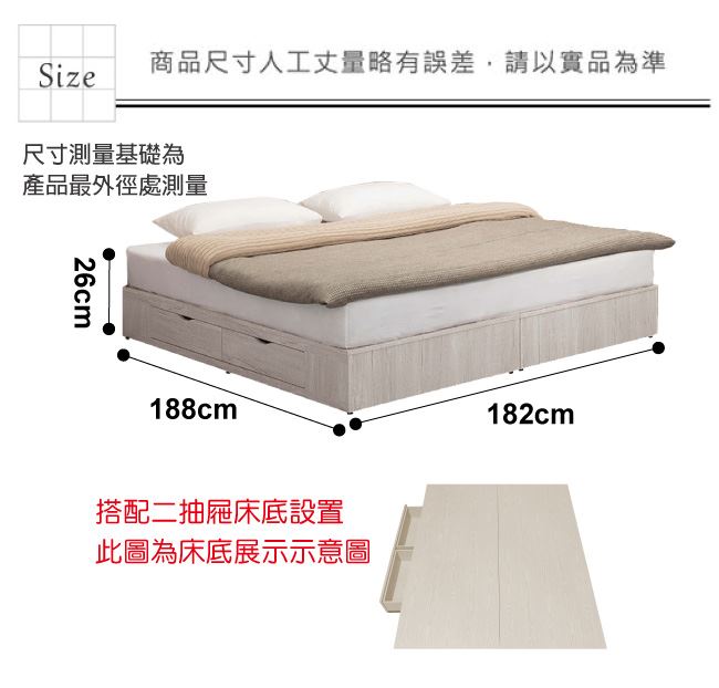 材質 | ◆產品名稱: 【綠家居】古利德 現代6尺雙人加大二抽床底(不含床墊) 產品尺寸: 床底尺寸:(寬)182x(深)188x(高)26./公分 ◆材質: 材質:防蛀木心板+六分木床板+防潮耐磨底座 塗漆:優利坦全包式耐磨噴漆處理