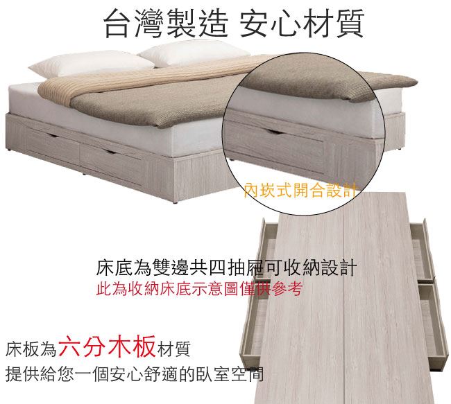 商品 介紹 | 【綠家居】古利德 現代6尺雙人加大四抽床底(不含床墊) 淺橡木紋色系+現代簡約風格+安心材質製造,整體採用防蛀木心板+六分木床板+防潮耐磨底座等安心材質製造,外層採用優利坦全包式耐磨噴漆處理搭配採用雙邊開合收納四抽屜便利設計,全由專人配送到家,專業安心服務,替你省下更多時間! 【商品特色】 淺橡木紋色系+現代簡約風格+安心材質製造,使用放心+搭配居家更便利 採用防蛀木心板+六分木床板+防潮耐磨底座等安心材質製造 採用雙邊開合收納四抽屜便利設計 此商品不需要DIY組立,此商品為組立後之成品 品質保證、專業設計、貼心服務 全由專人配送到家,專業安心服務,替您省下更多時間 |
