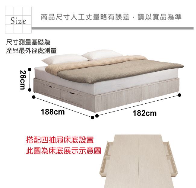 材質 | ◆產品名稱: 【綠家居】古利德 現代6尺雙人加大四抽床底(不含床墊) 產品尺寸: 床底尺寸:(寬)182x(深)188x(高)26/公分 ◆材質: 材質:防蛀木心板+六分木床板+防潮耐磨底座 塗漆:優利坦全包式耐磨噴漆處理