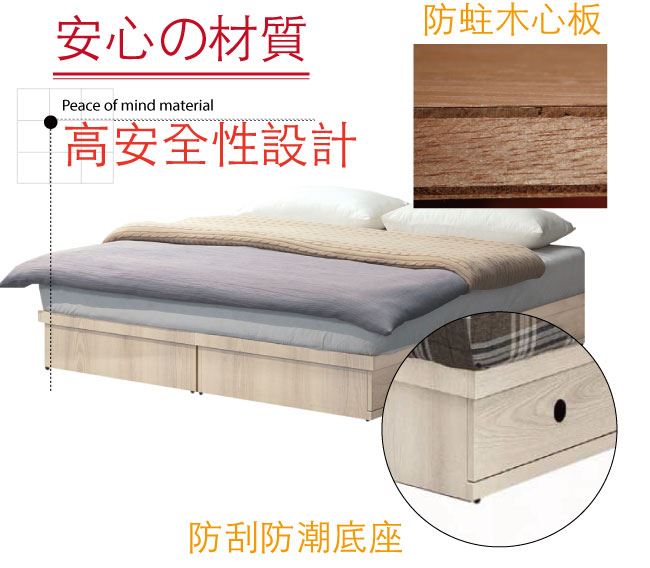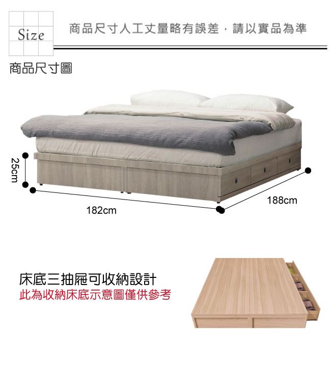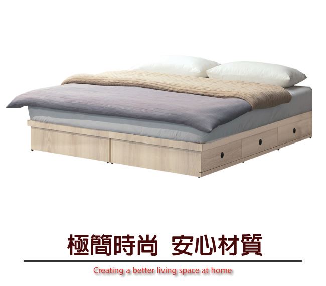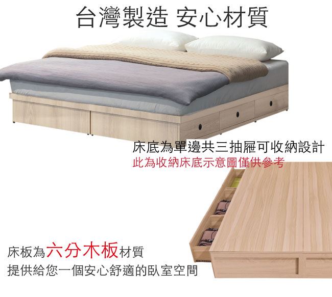 商品 介紹 | 【綠家居】凡帝斯 6尺雙人加大三抽床底(二色可選+不含床墊) 二色可選+現代簡約風格+安心材質製造,整體採用防蛀木心板+六分木床板+防潮耐磨腳座等安心材質製造,產品外層採用防潮耐磨噴漆處理搭配採用單邊開合三抽屜床底收納空間設計,全由專人配送到家,專業安心服務,替你省下更多時間! 【商品特色】 二色可選+現代簡約風格+安心材質製造,使用放心+搭配居家更便利 採用防蛀木心板+六分木床板+防潮耐磨腳座等安心材質製造 產品外層採用防潮耐磨噴漆處理 搭配採用單邊開合三抽屜床底收納空間設計 此商品不需要DIY組立,此商品為組立後之成品 品質保證、專業設計、貼心服務 全由專人配送到家,專業安心服務,替您省下更多時間 |